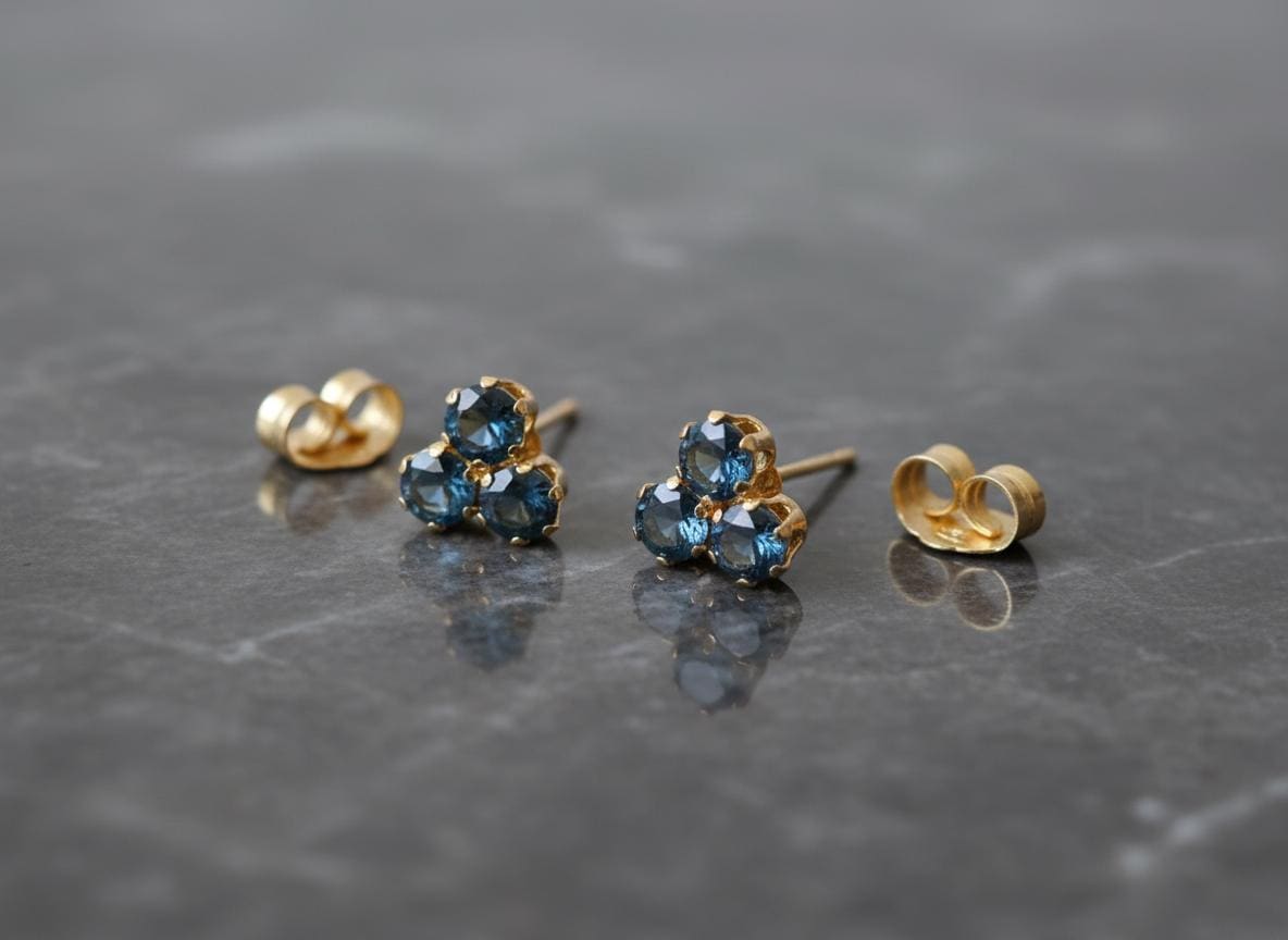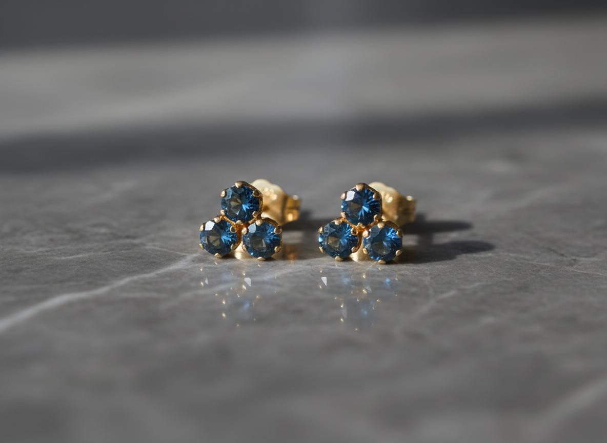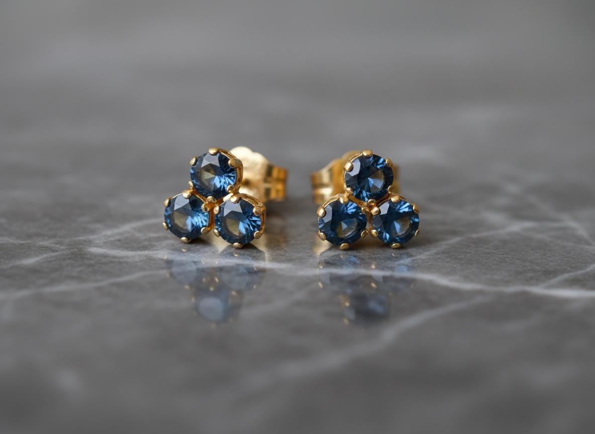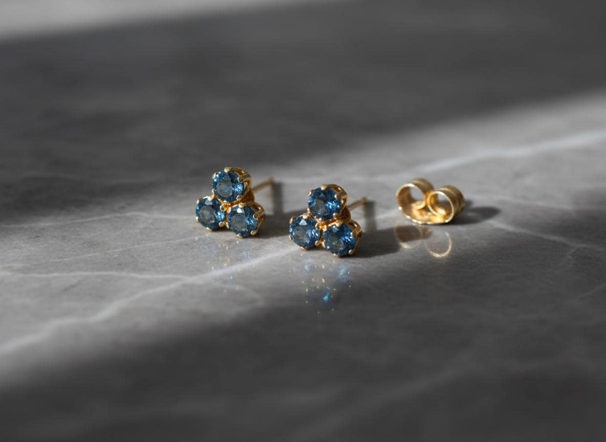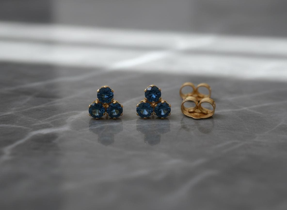 These 14k gold London blue topaz stud earrings feature a trio of brilliant 3mm stones arranged in a refined cluster—small, radiant, and endlessly elegant.