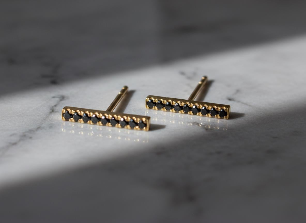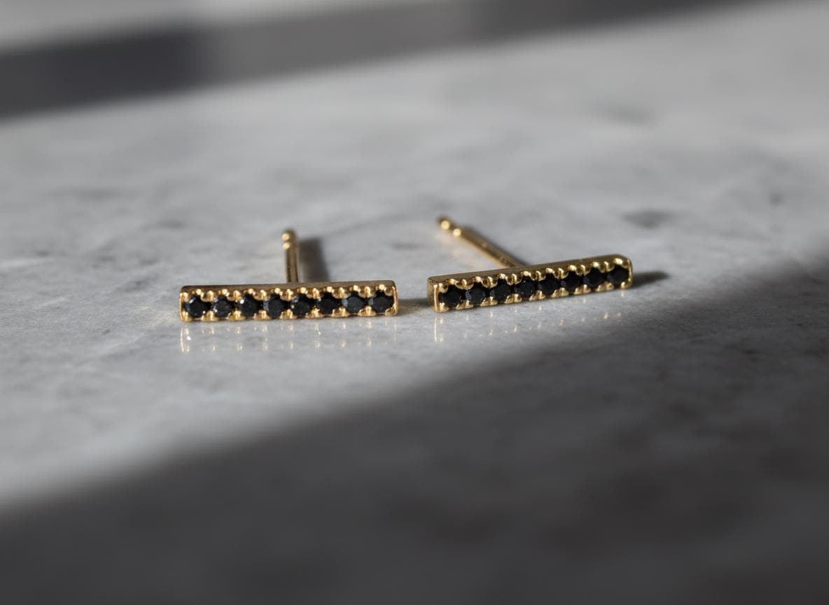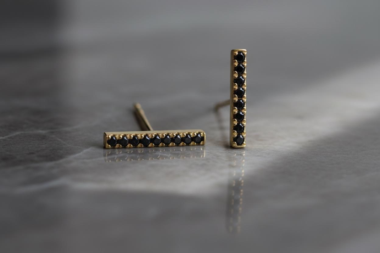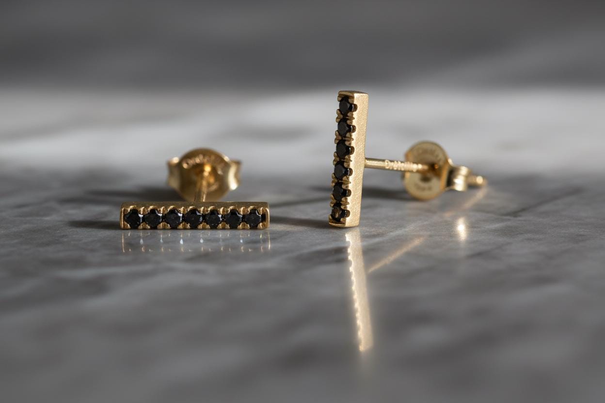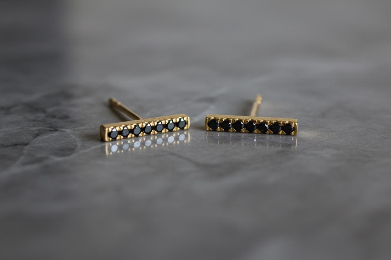 Bold, sleek, and beautifully modern — these 14k solid gold black diamond bar earrings are the perfect blend of minimalism and edge. Designed with a clean elongated silhouette, each earring features a row of sparkling 1.3mm black diamonds (0.015 ct each) set along a polished gold bar for a refined, architectural look.