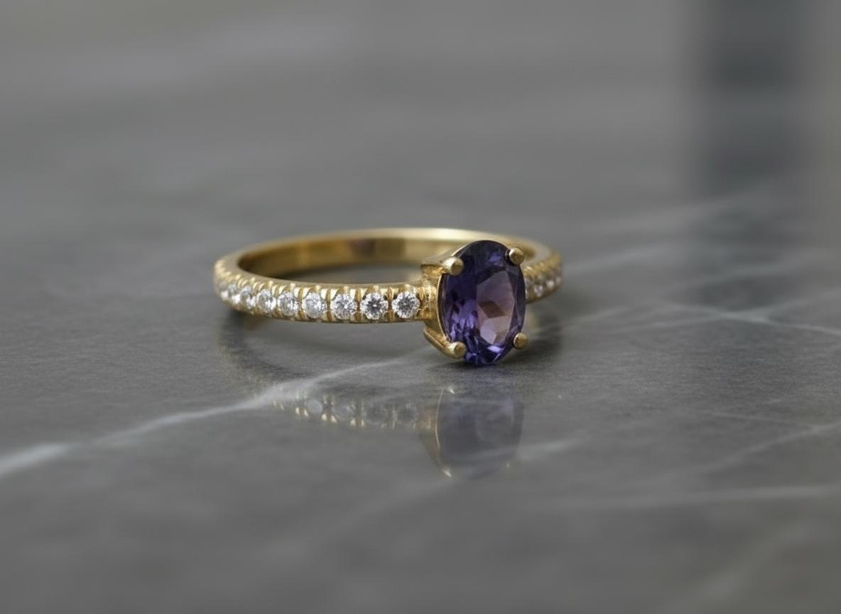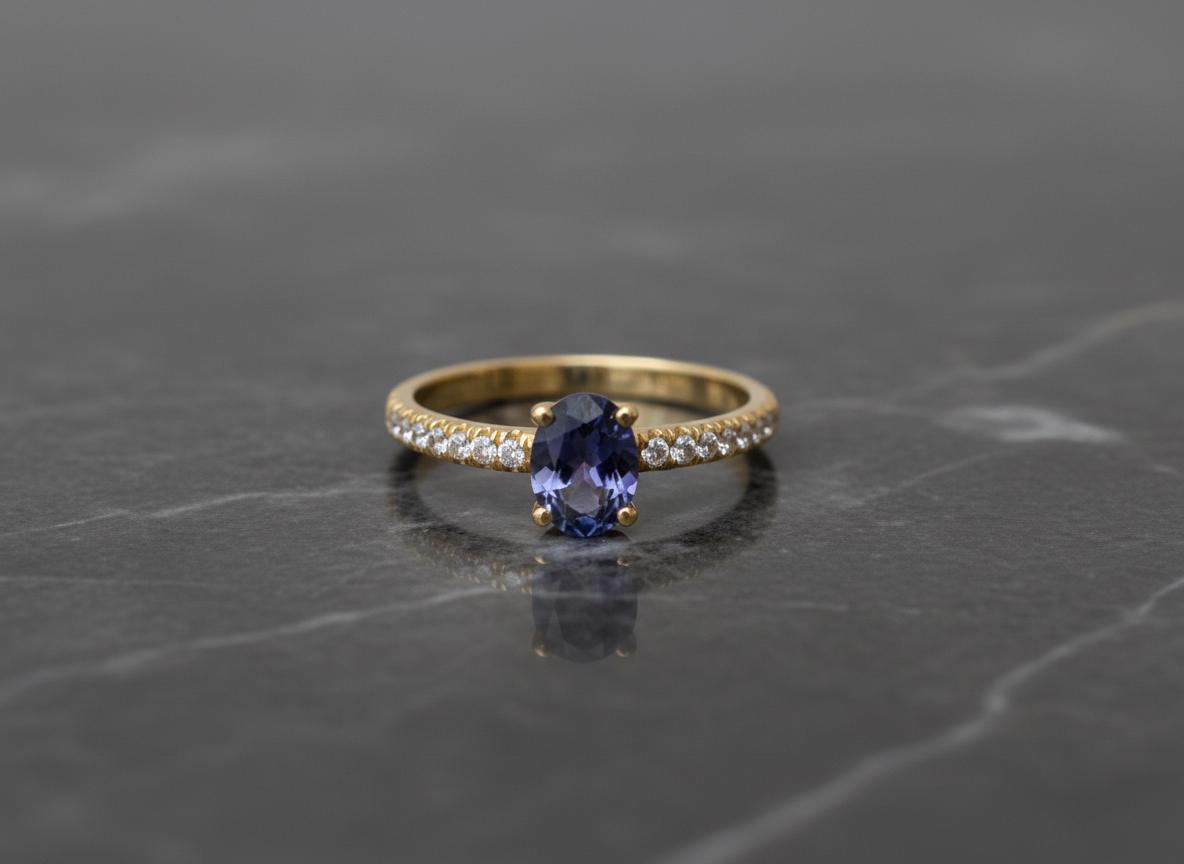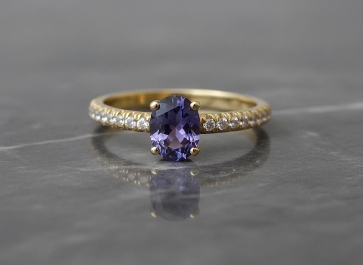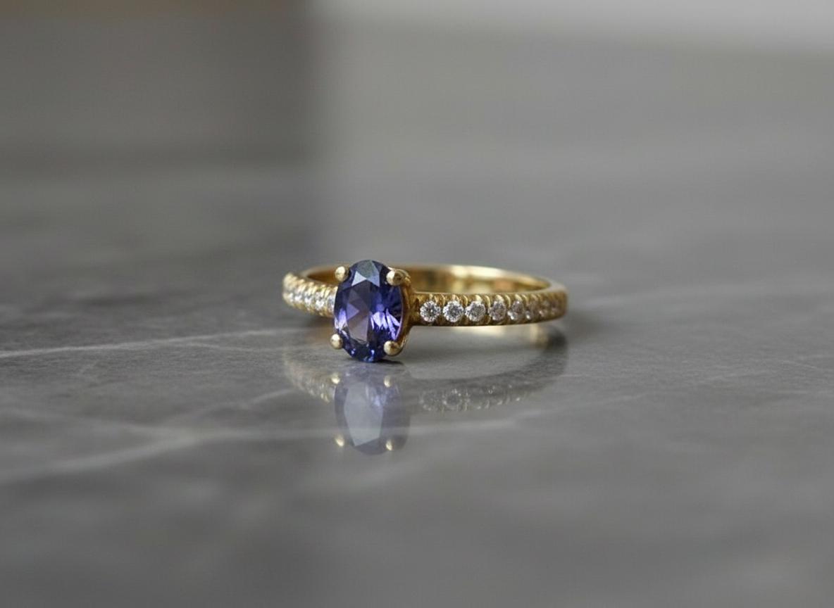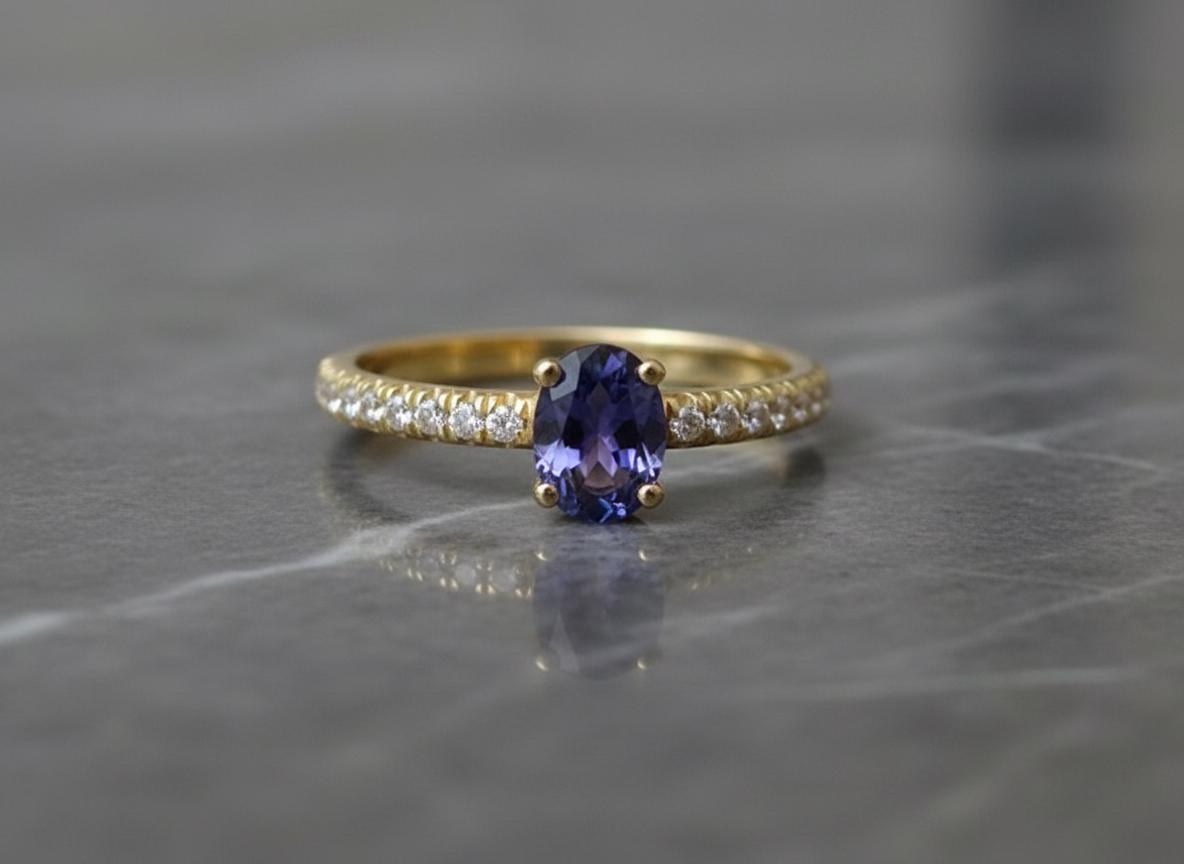 A ring that glows with a soft, mesmerizing violet-blue — this handcrafted 14k gold design features a 4×6mm natural tanzanite, the cherished December birthstone known for its enchanting color shift and rare beauty.
