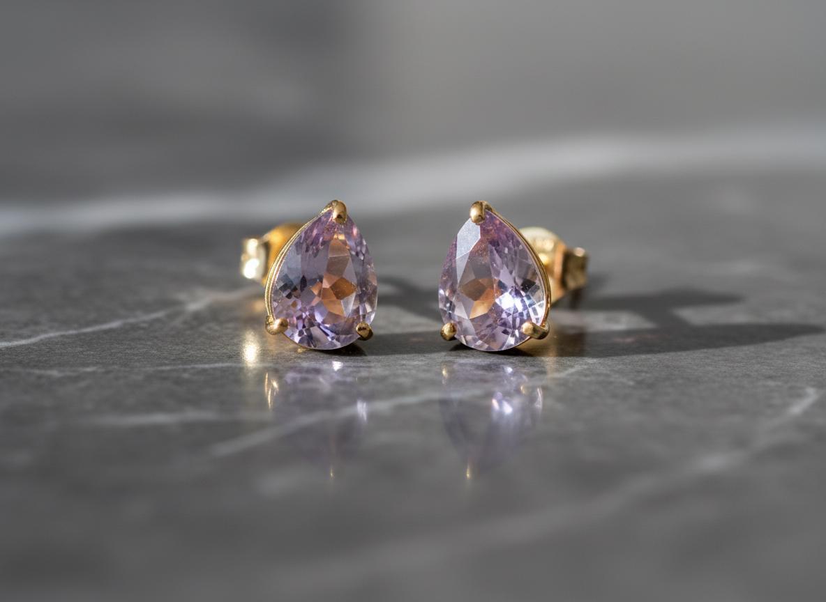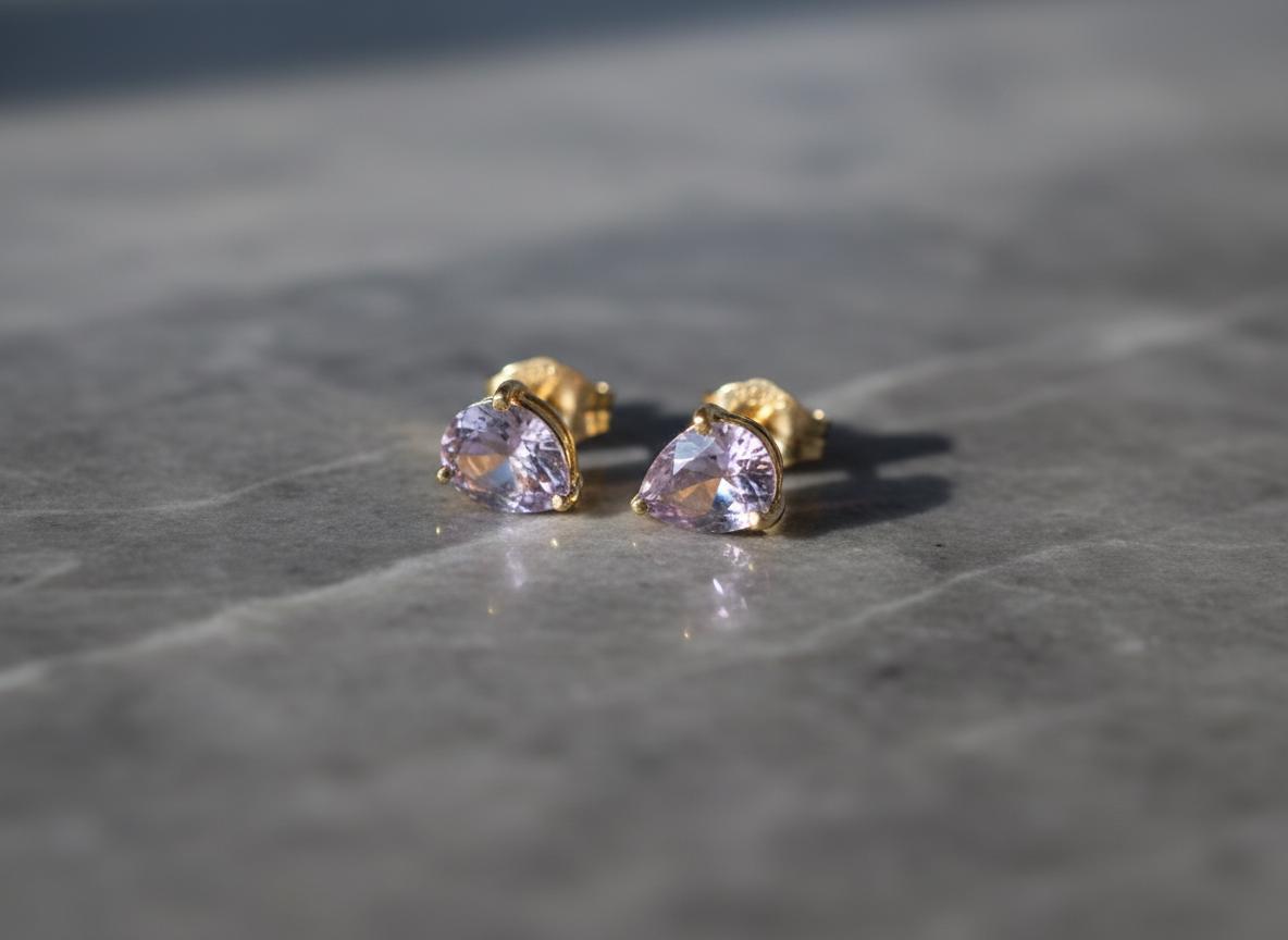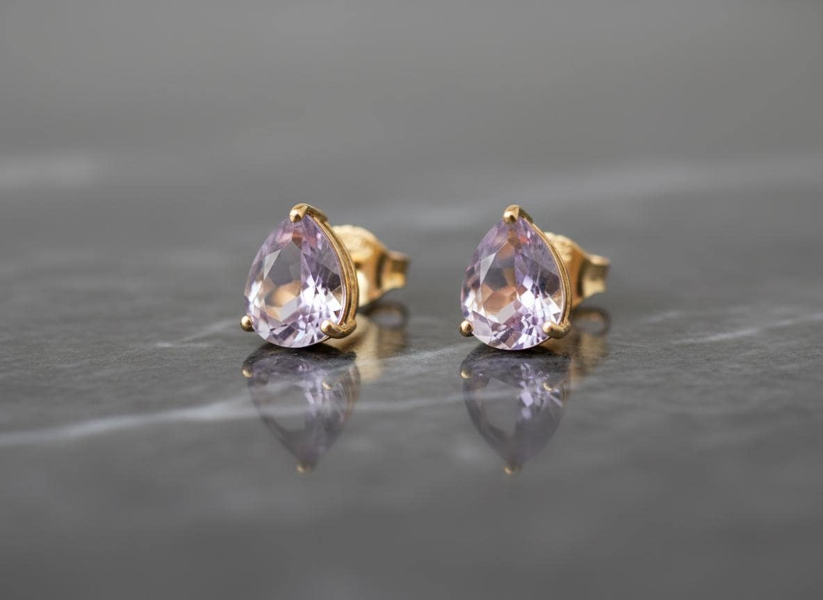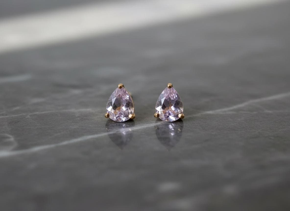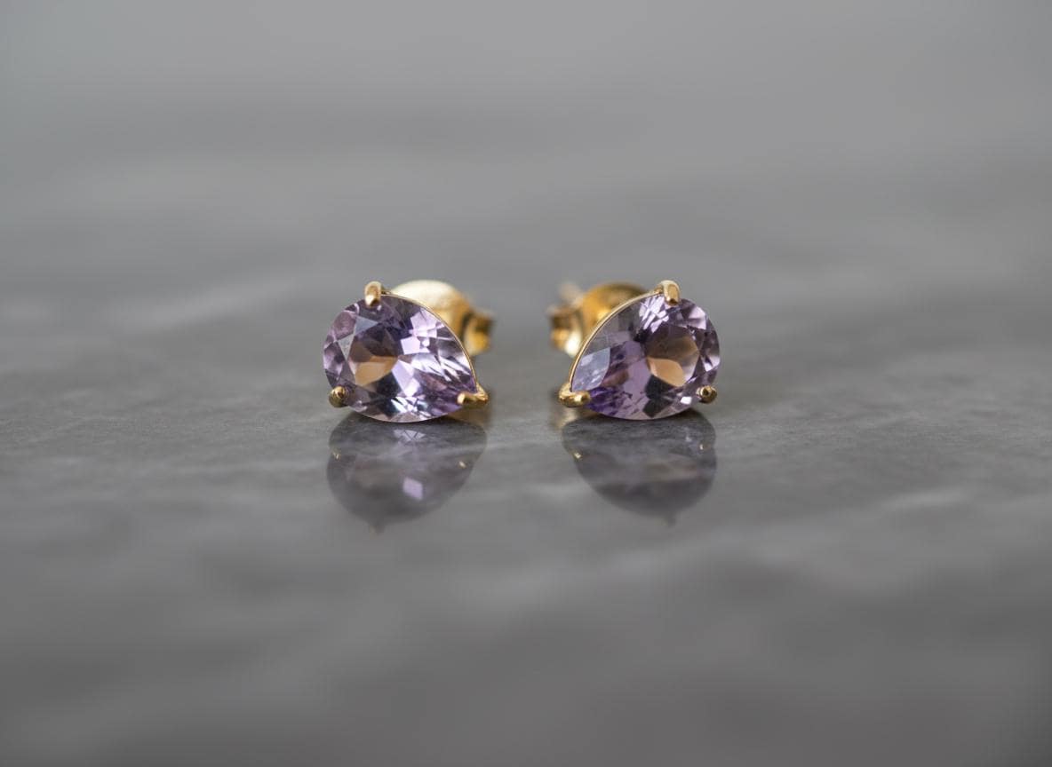 Delicate, feminine, and softly luminous — these 14k gold stud earrings feature 5×7mm natural pear-cut amethysts, known for their gentle lavender-purple glow. Set in a classic three-prong basket, the gemstones catch the light from every angle, creating a refined sparkle perfect for everyday elegance or special moments.