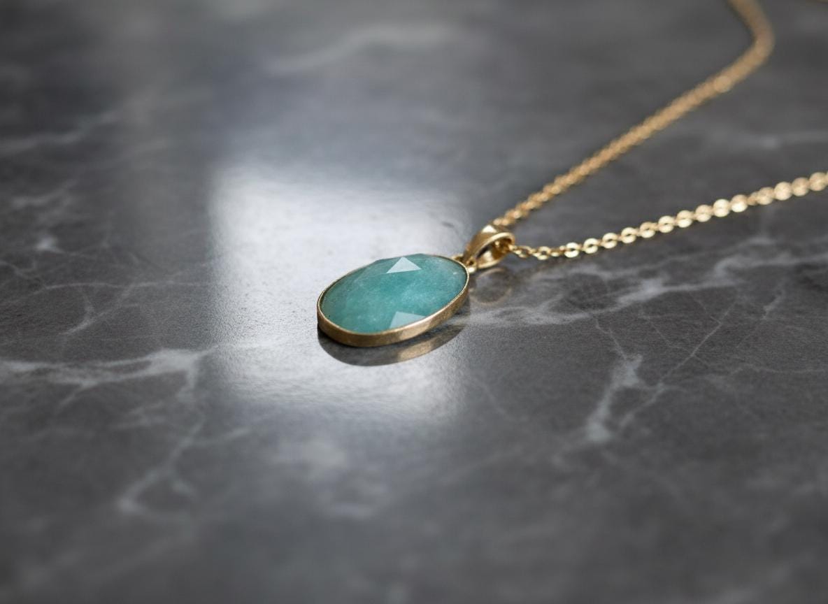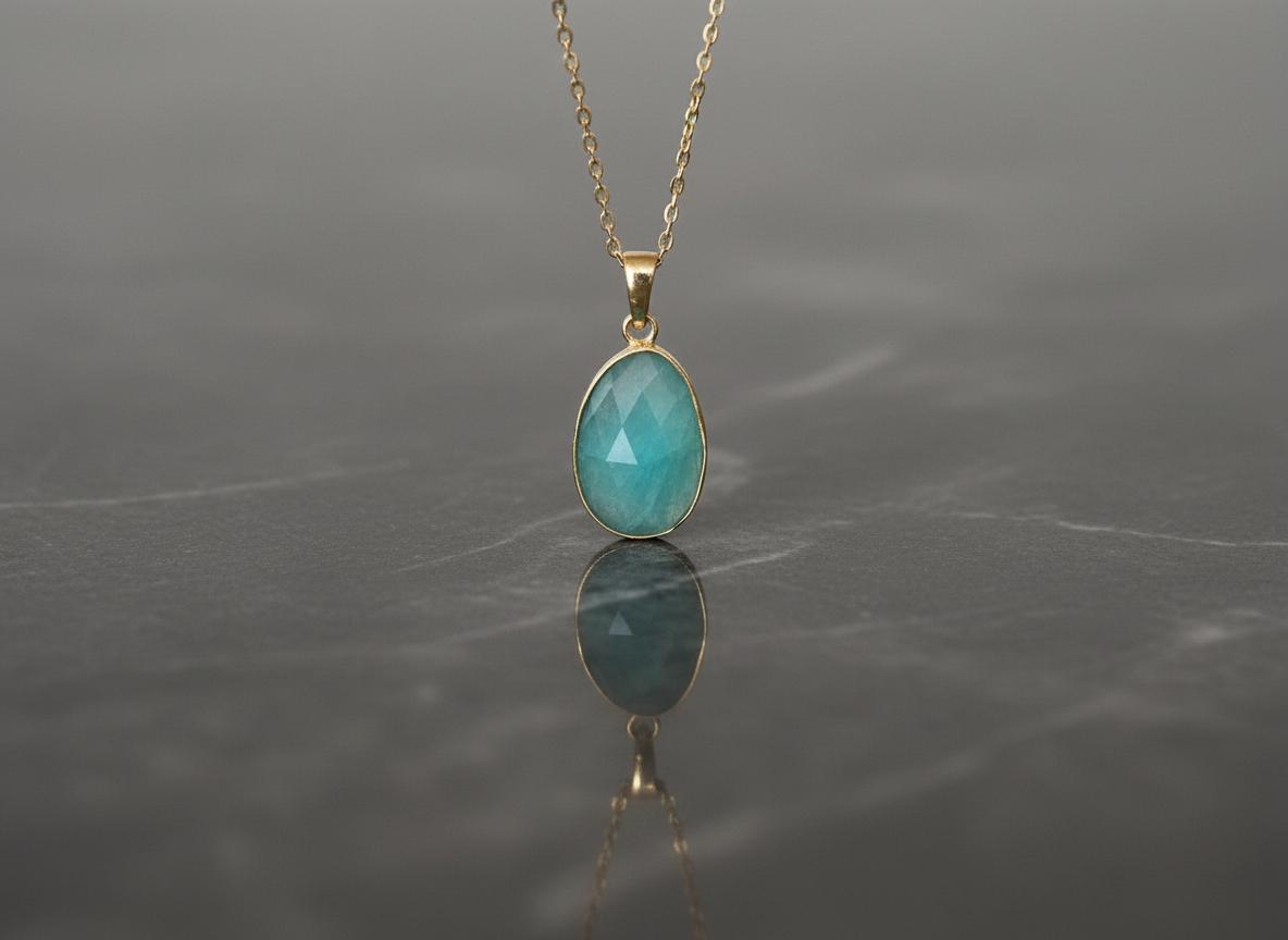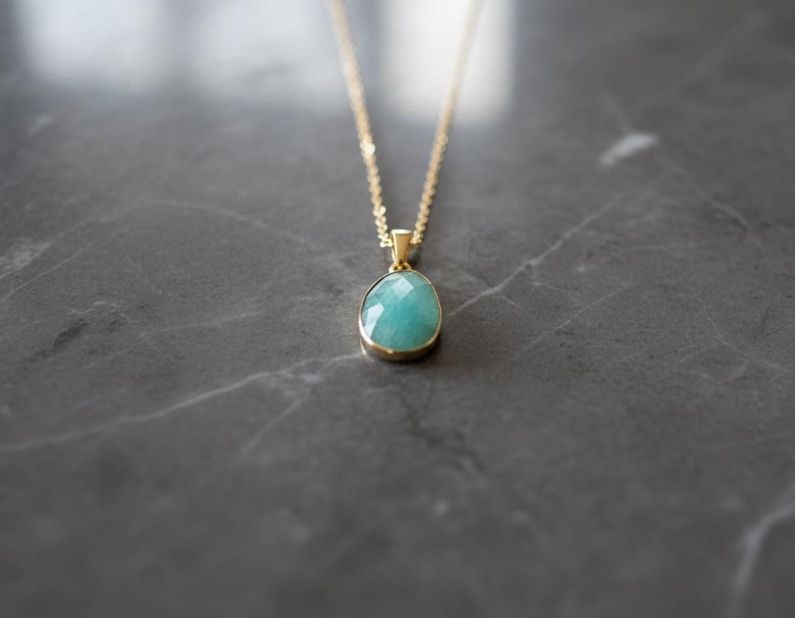 This handcrafted pendant features a natural 10×15mm rose-cut amazonite, its soft glow reminiscent of sea foam and quiet mornings. Each stone carries its own gentle patterning, making every piece subtly one-of-a-kind.
