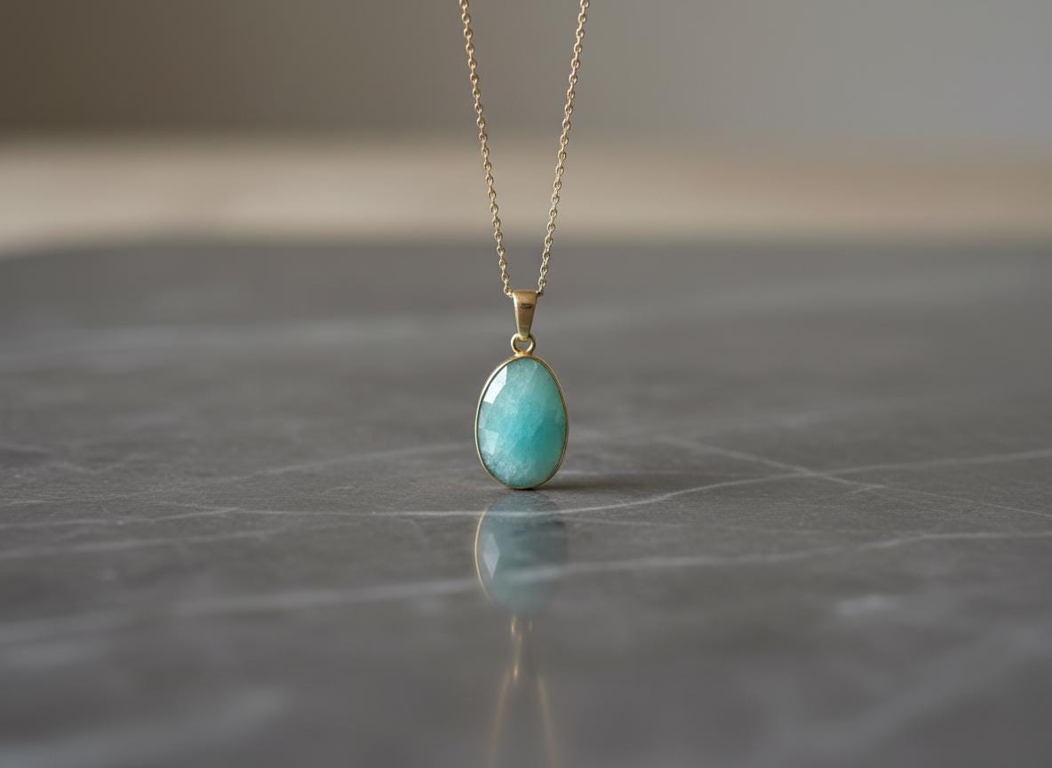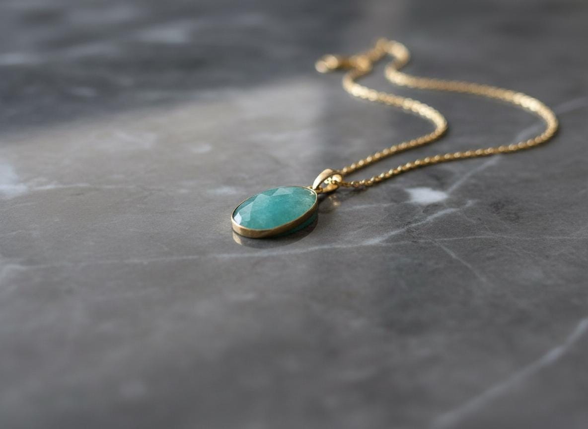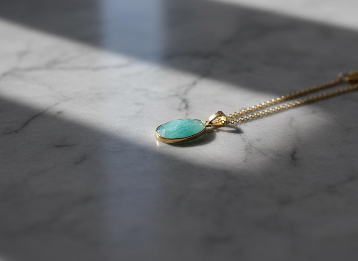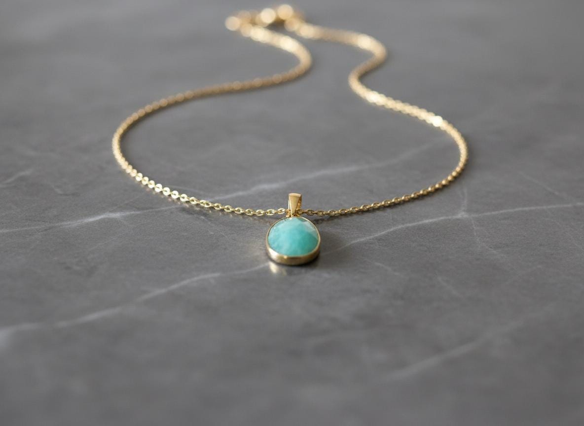 This handcrafted pendant features a natural 10×15mm rose-cut amazonite, its soft glow reminiscent of sea foam and quiet mornings. Each stone carries its own gentle patterning, making every piece subtly one-of-a-kind.