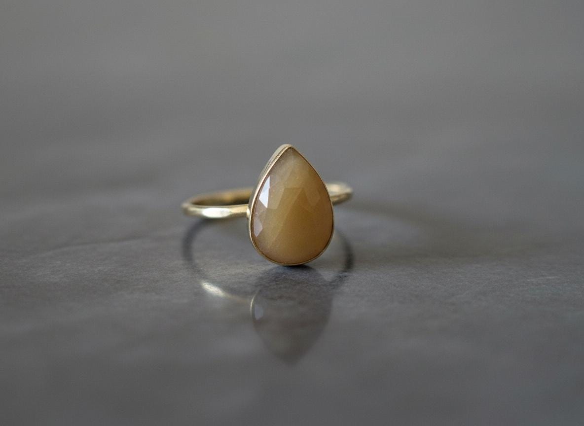 A luminous pear-shaped yellow sapphire takes center stage, framed in a smooth gold bezel that lets the stone glow with its natural warmth.