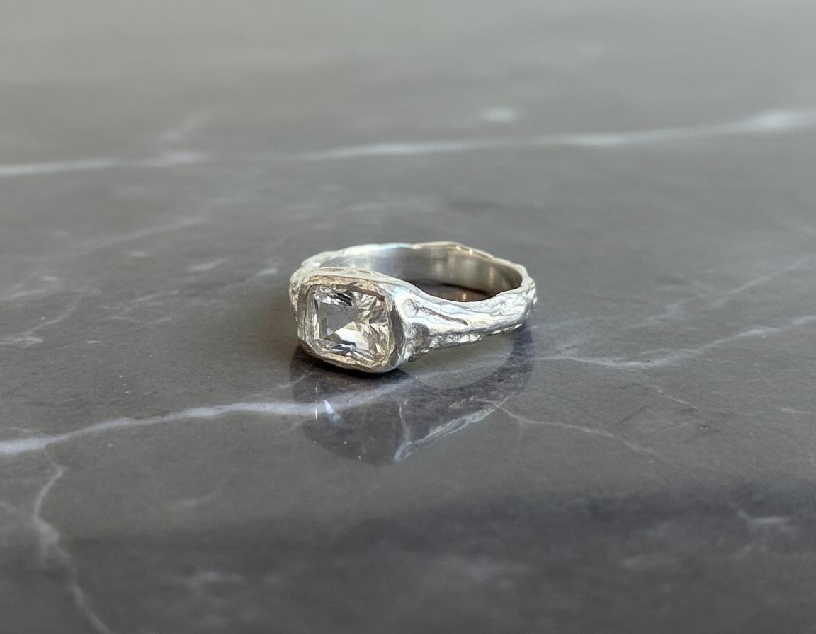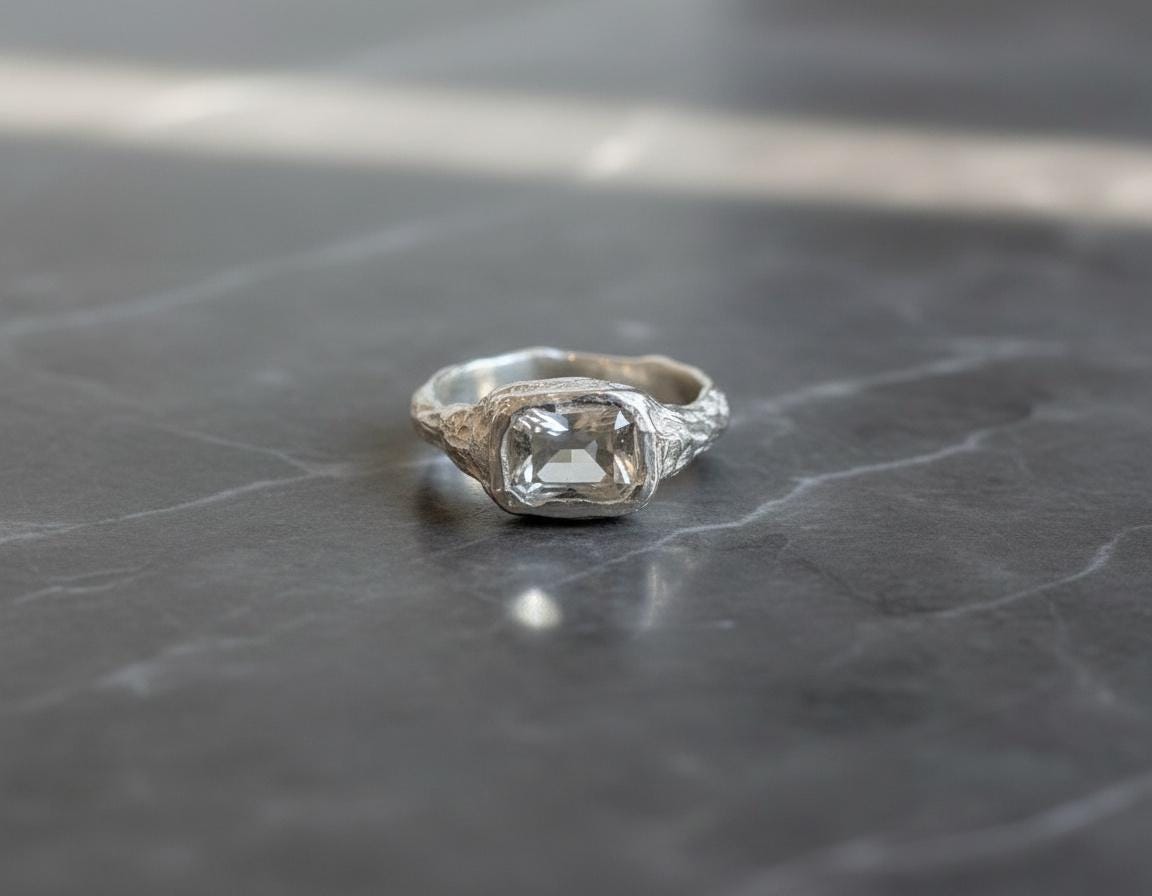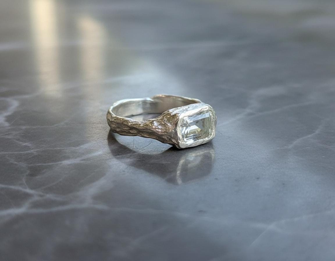 White topaz reflects light with a crisp, glassy brilliance, making this ring an effortless everyday statement or a subtle alternative engagement ring. Each ring is made by hand, giving it a slightly imperfect, natural character that celebrates individuality.
