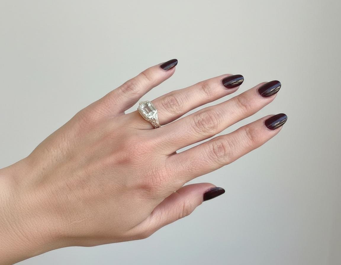 Perfect worn alone or stacked with simpler bands, this ring balances softness and strength — a piece that feels timeless, grounded, and quietly striking.