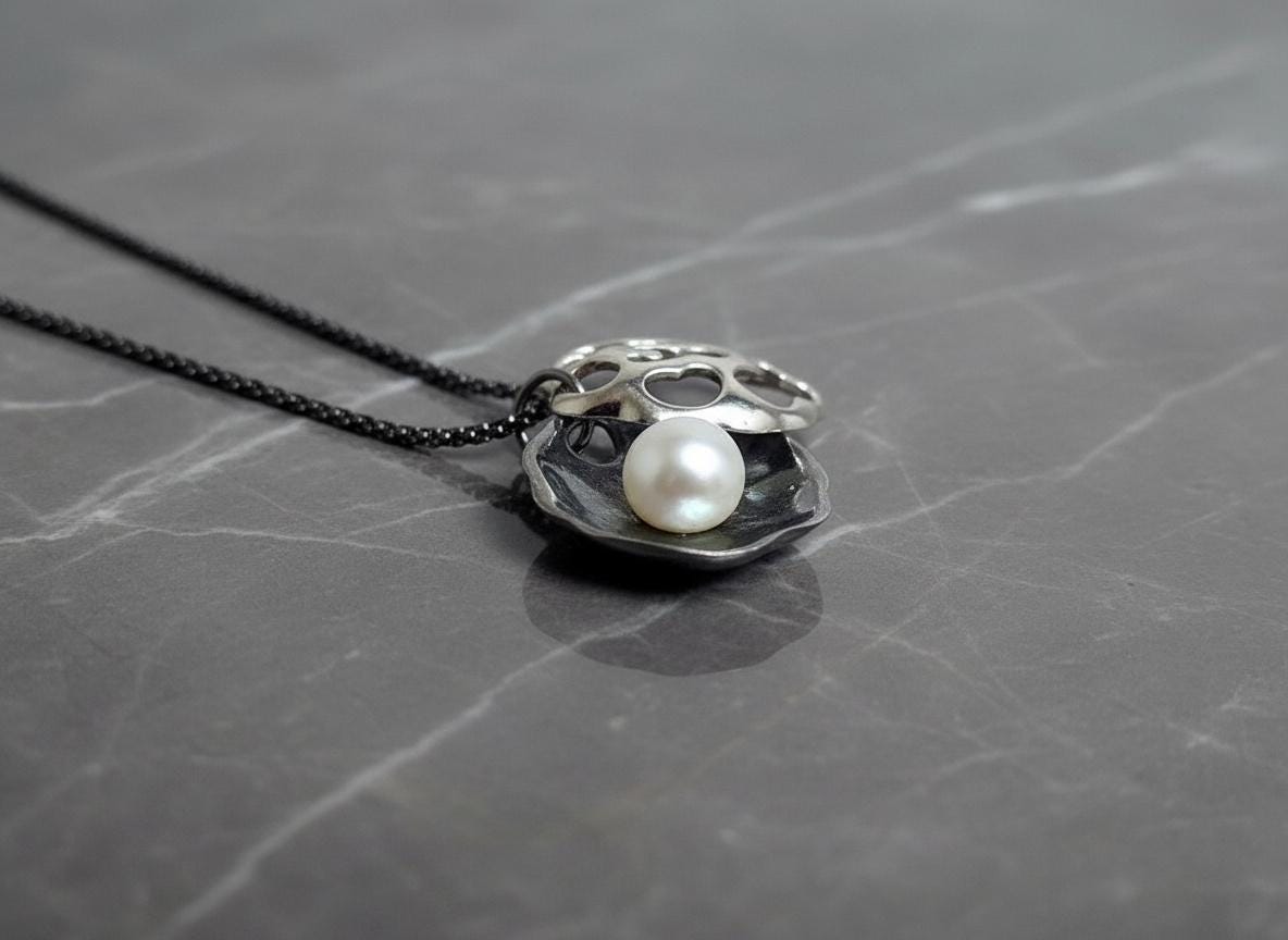 Handcrafted from solid sterling silver, the pendant has an intentionally raw, architectural feel, balanced by the classic softness of the pearl. Worn close to the skin, it becomes a subtle statement — understated, tactile, and timeless.