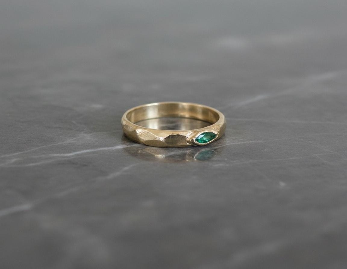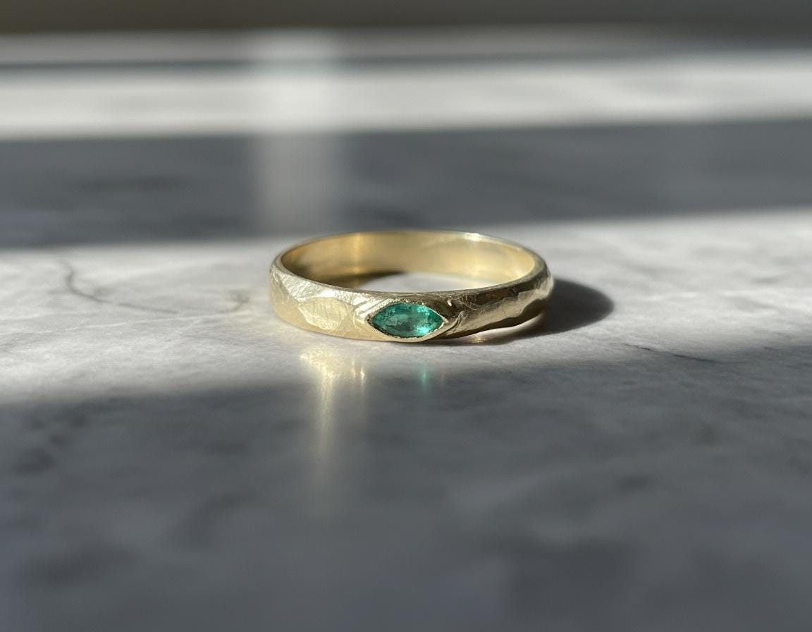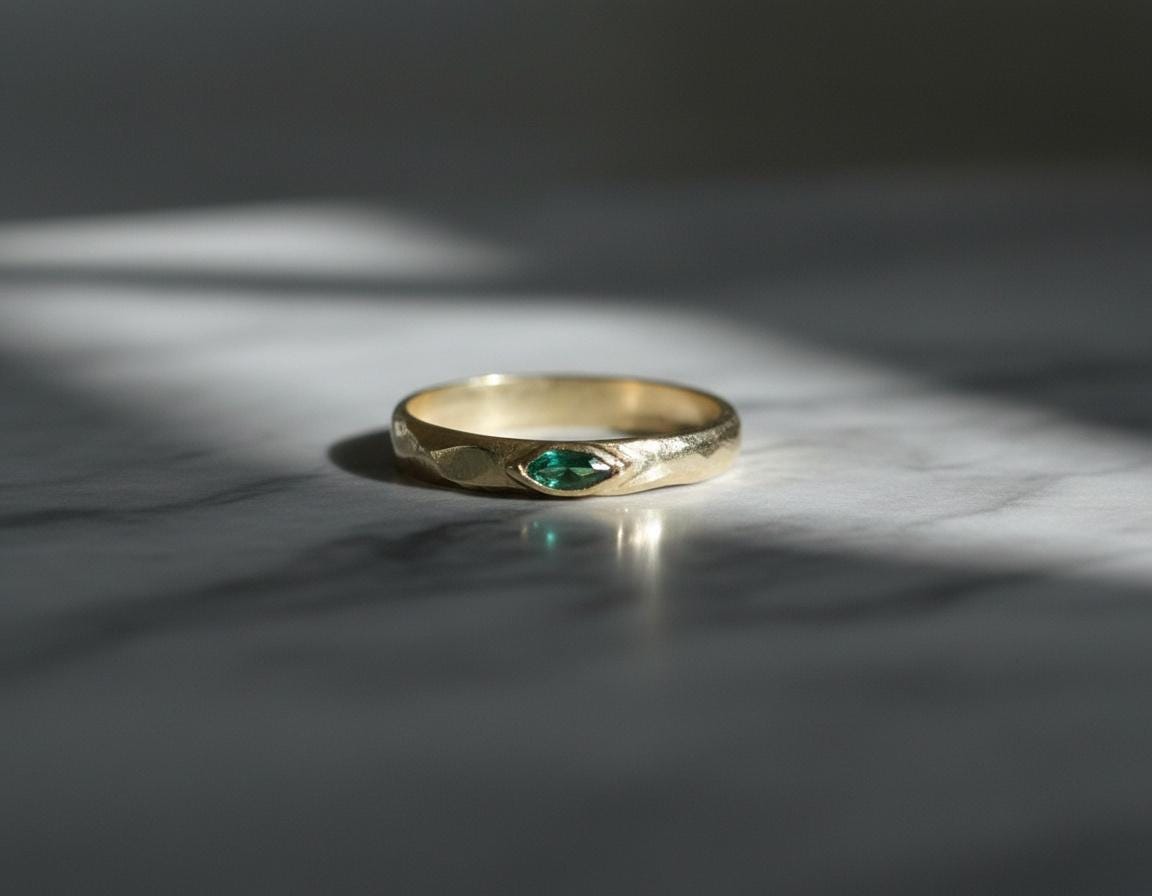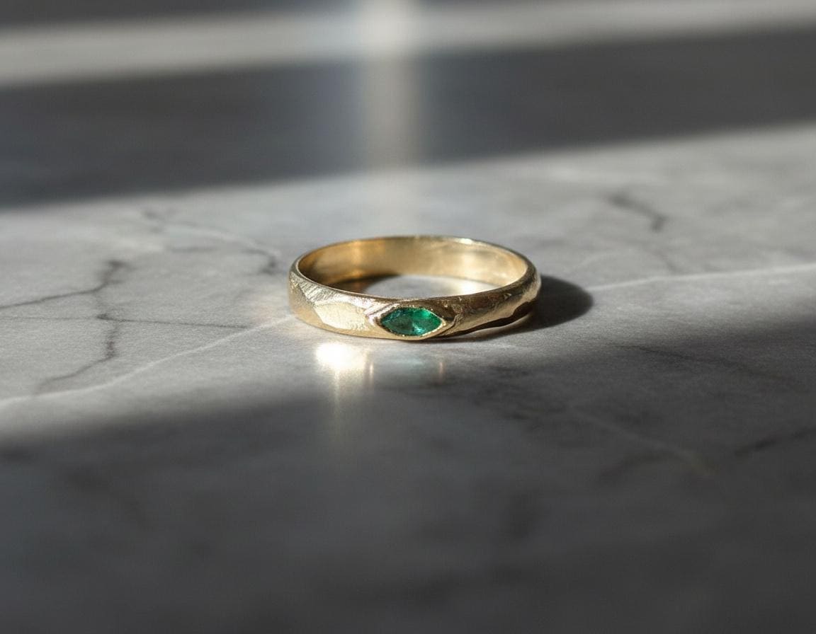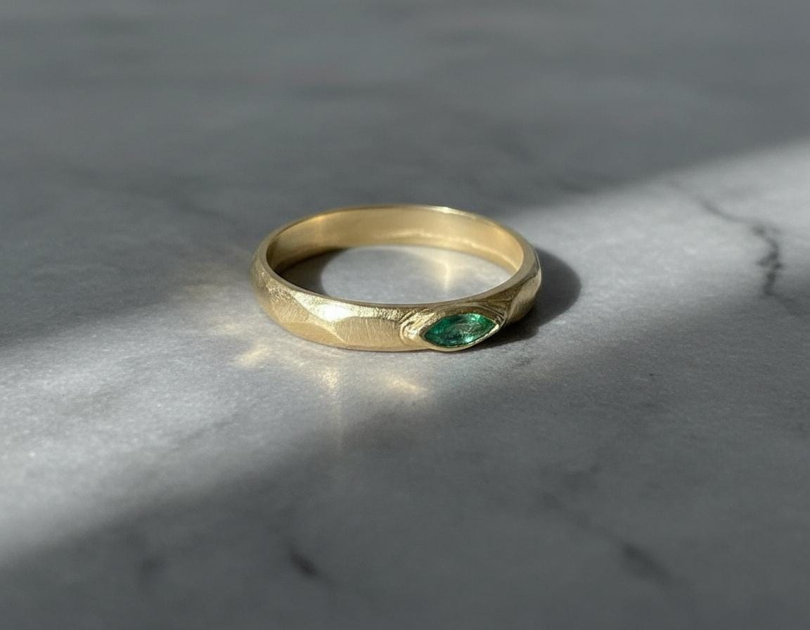 The softly faceted gold shank catches light with subtle texture, while the vivid green emerald adds a restrained touch of color. Designed for everyday wear, this ring is understated yet distinctive — a piece that reveals its beauty slowly.