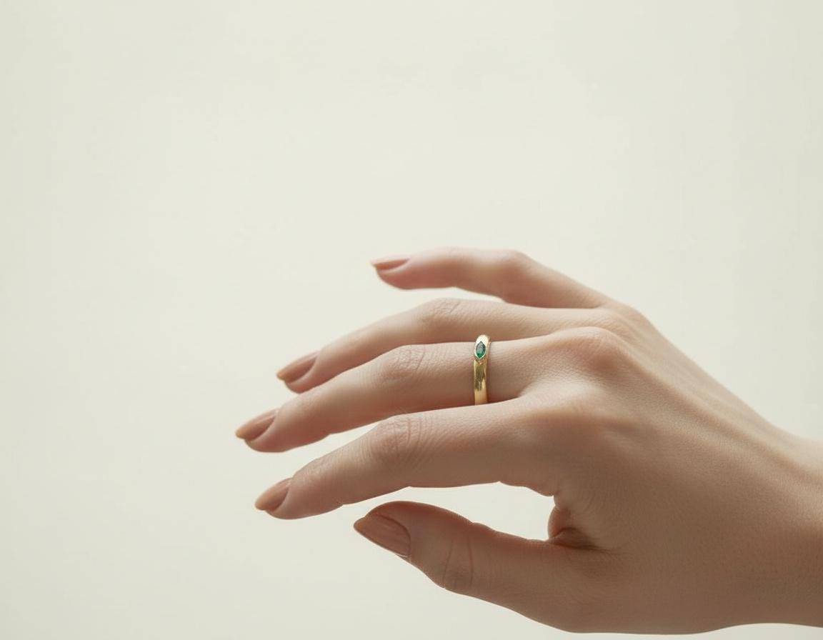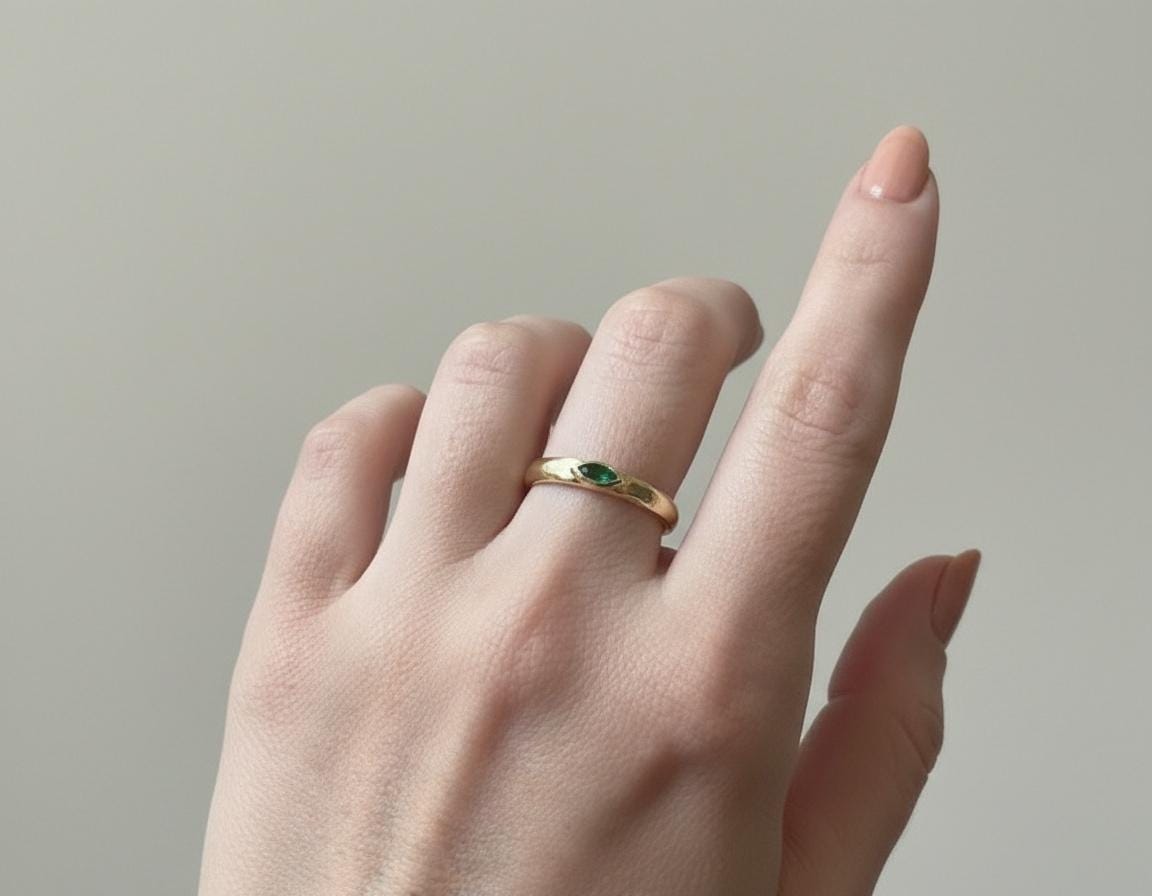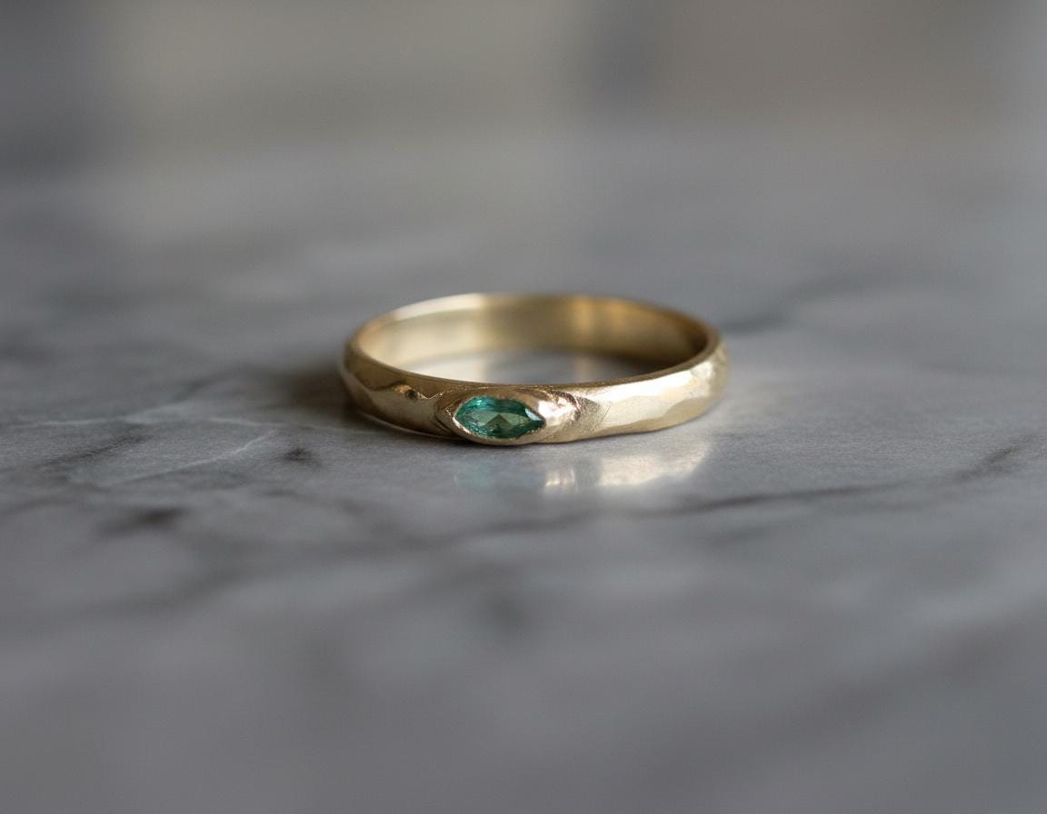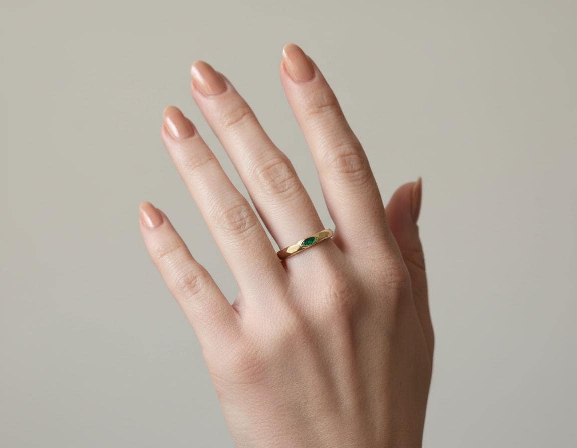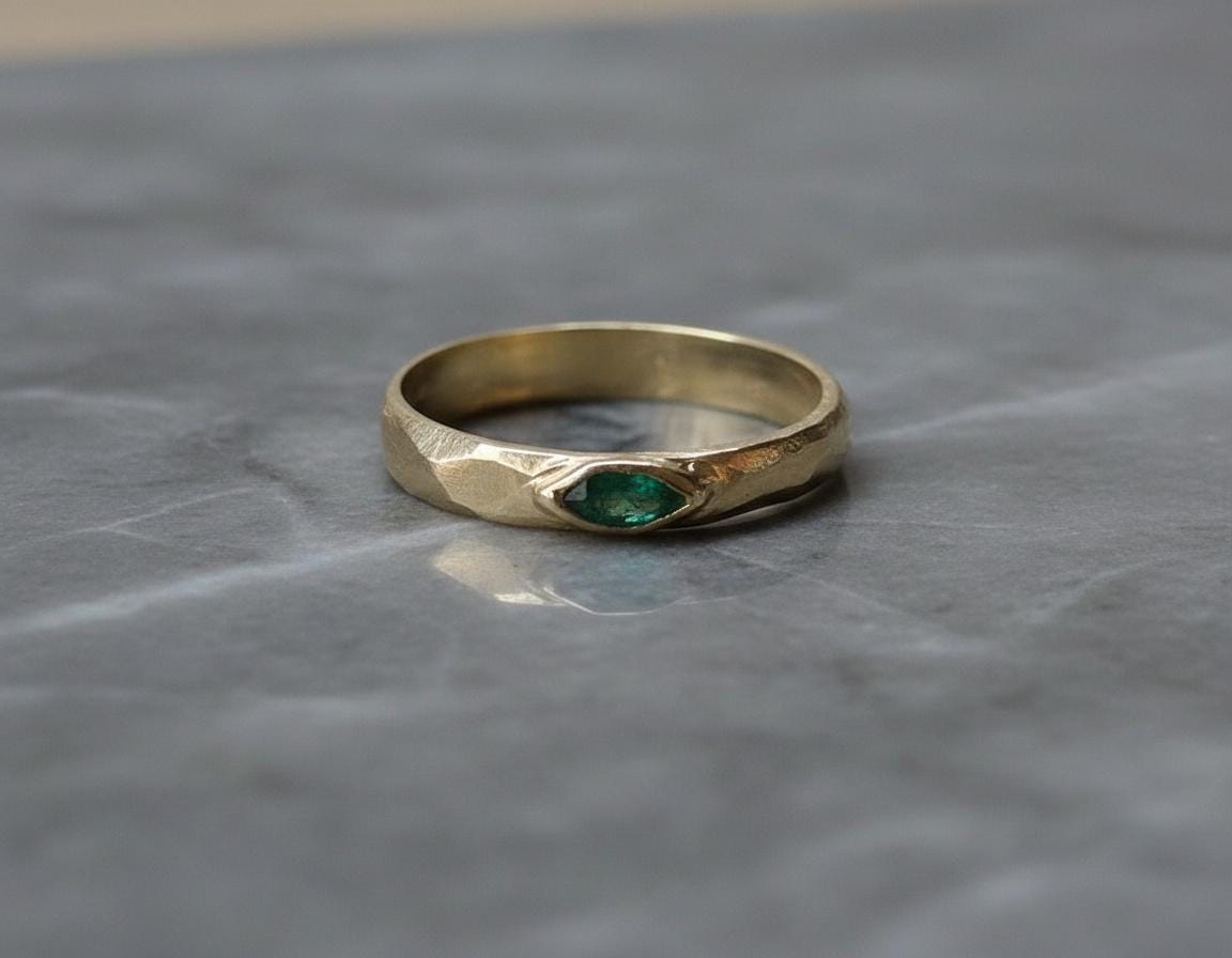 The softly faceted gold shank catches light with subtle texture, while the vivid green emerald adds a restrained touch of color. Designed for everyday wear, this ring is understated yet distinctive — a piece that reveals its beauty slowly.