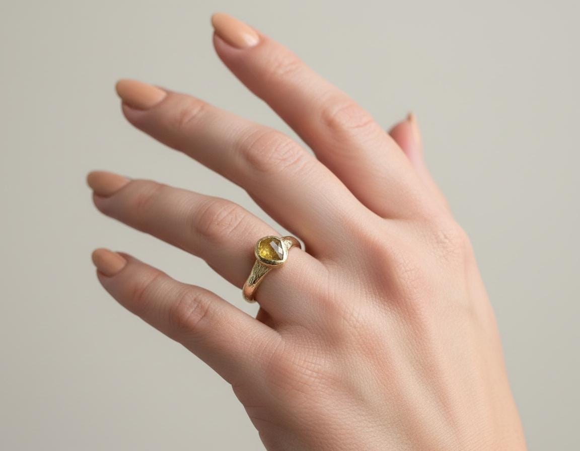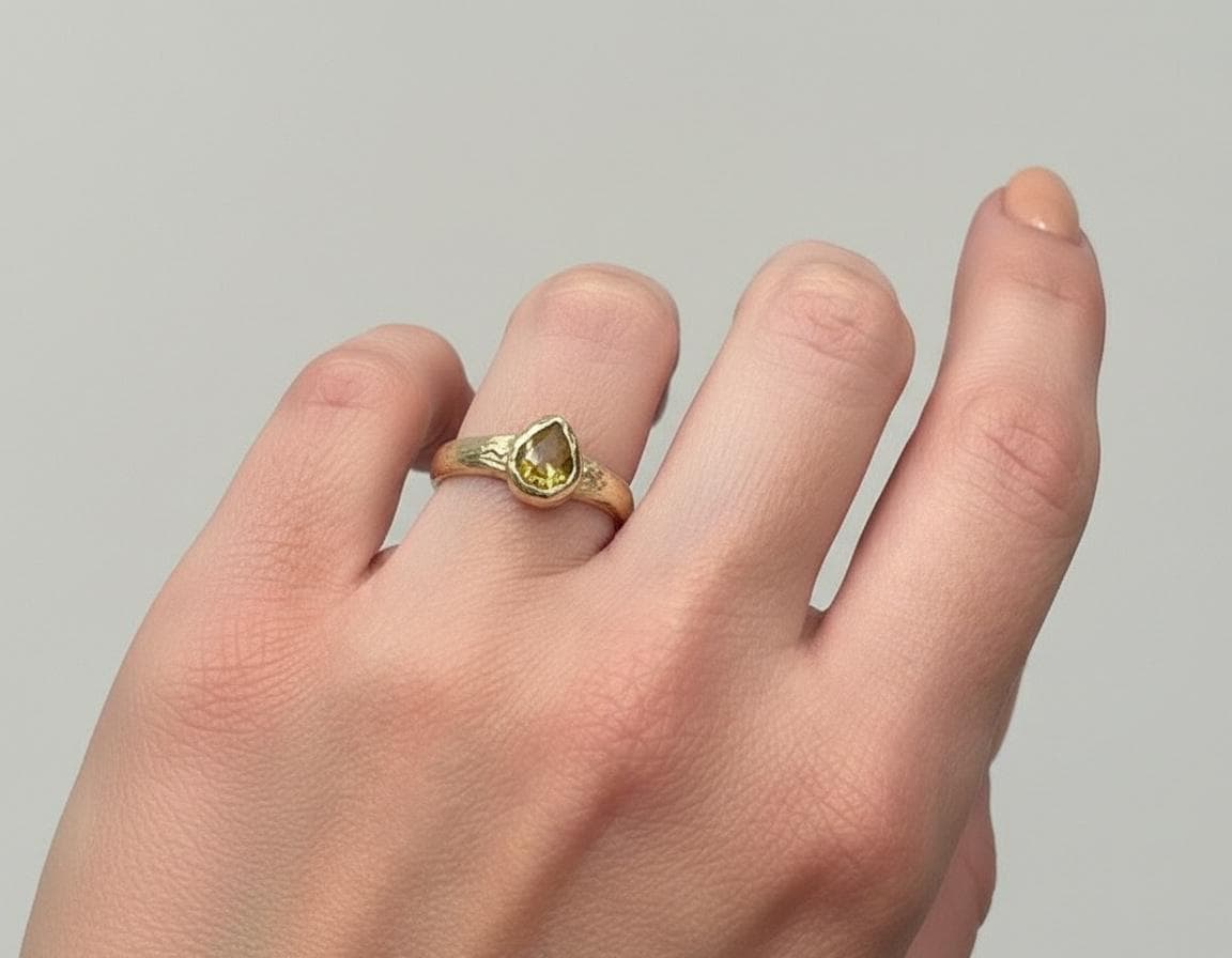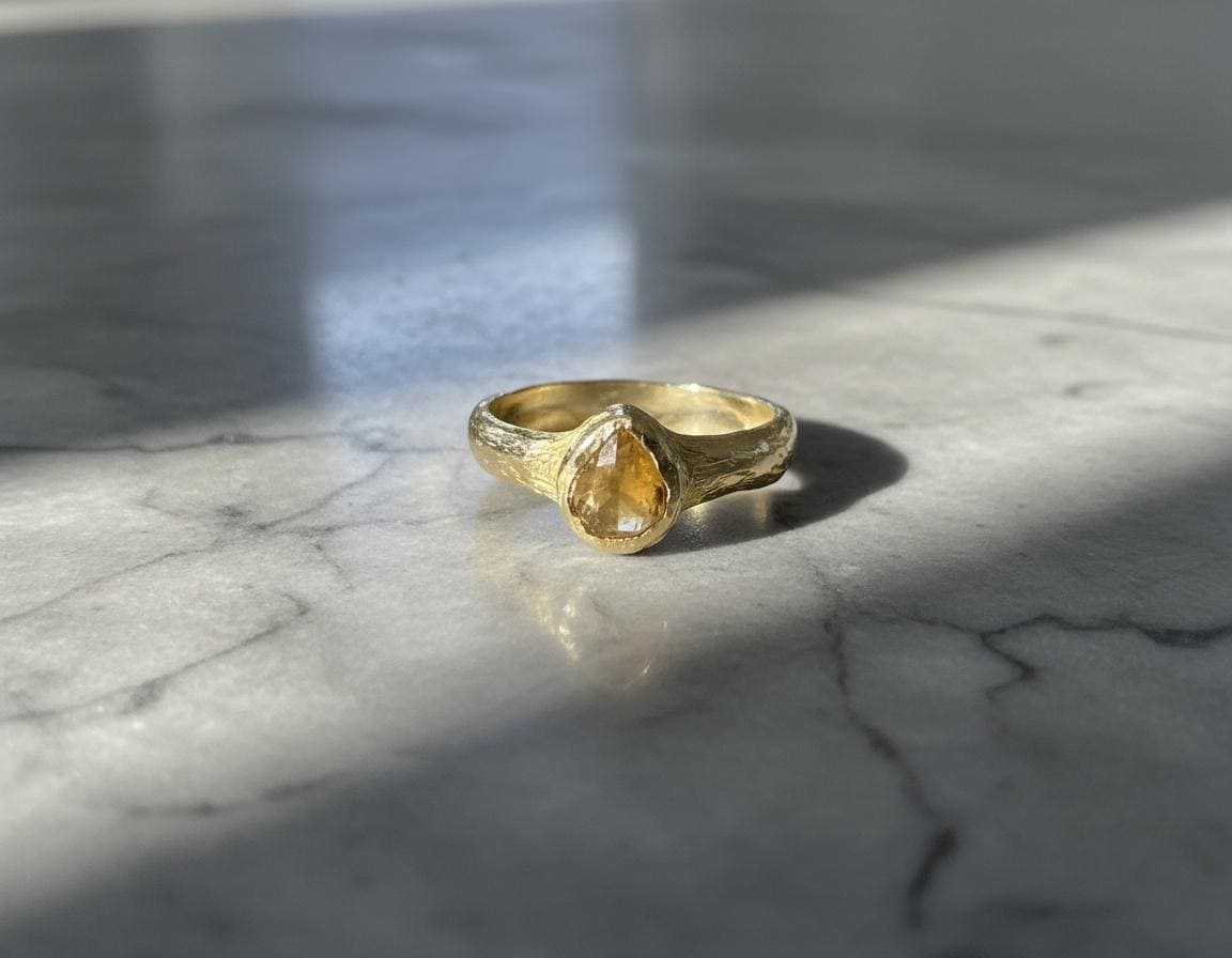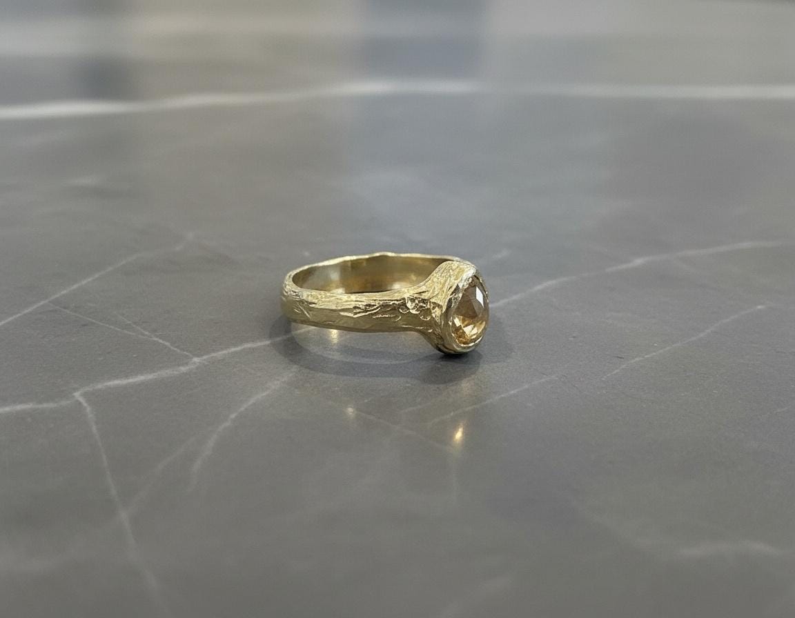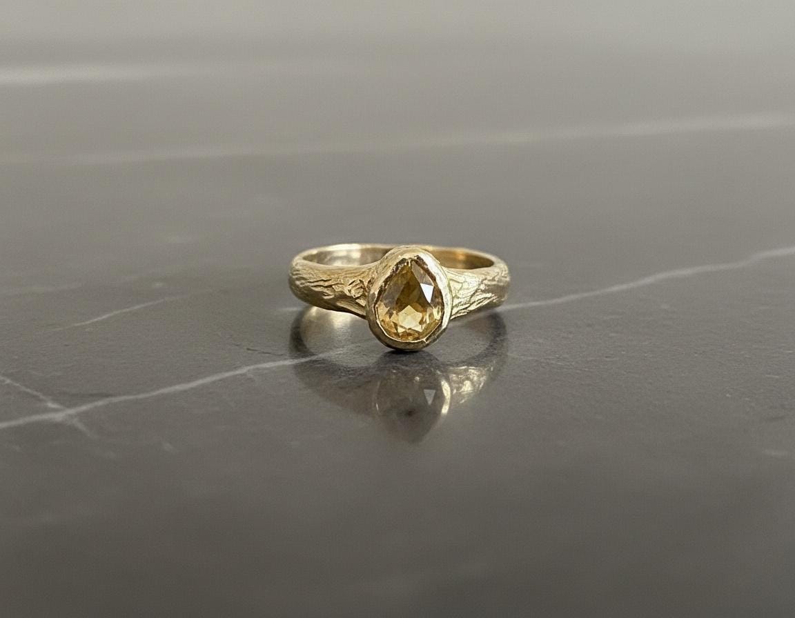 This handcrafted ring features a light brown vintage-cut diamond, softly glowing with warm, earthy tones. Set in solid 10K yellow gold, the stone is framed by an organically textured band that carries subtle marks of the hand that shaped it.