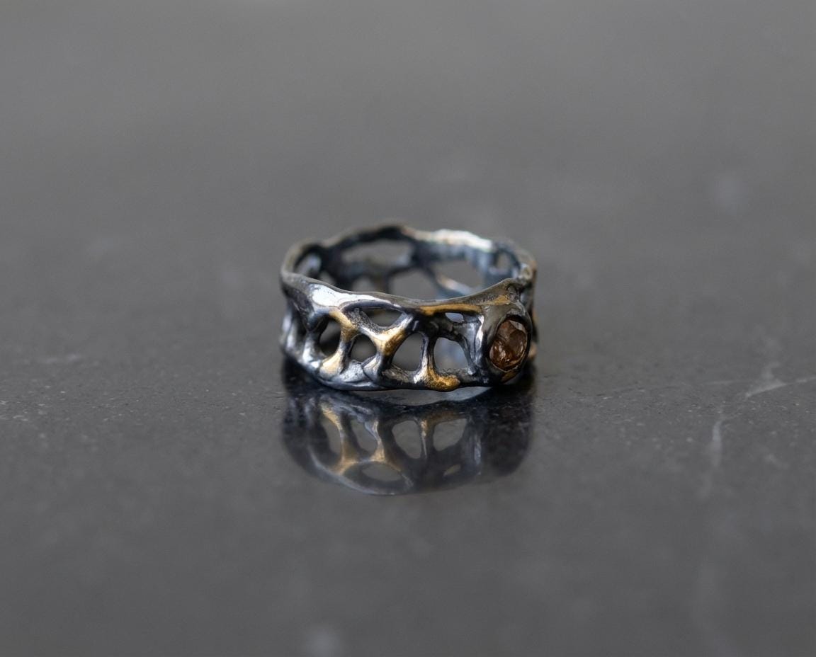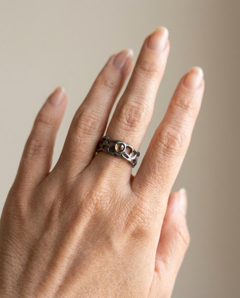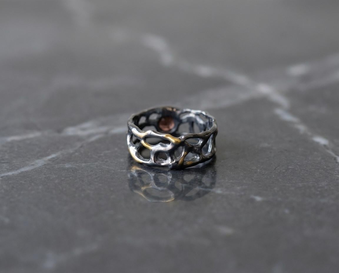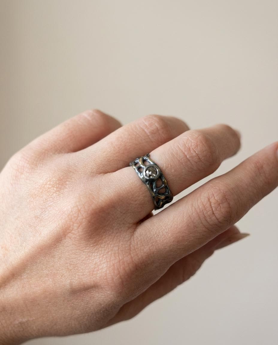This sculptural band is crafted in solid sterling silver and deeply oxidized to create contrast and depth. Organic openwork textures wrap around the finger like a fragment of something ancient. Soft gold-plated accents run through the surface, catching light against the darkened silver.