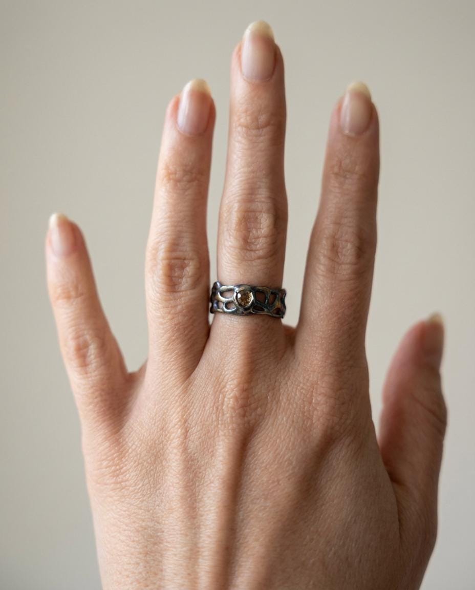 At the center sits a natural brown diamond — subtle, earthy, and quietly luminous. Its warm tone pairs beautifully with the oxidized silver and gold highlights, creating a piece that feels raw, architectural, and unapologetically modern.