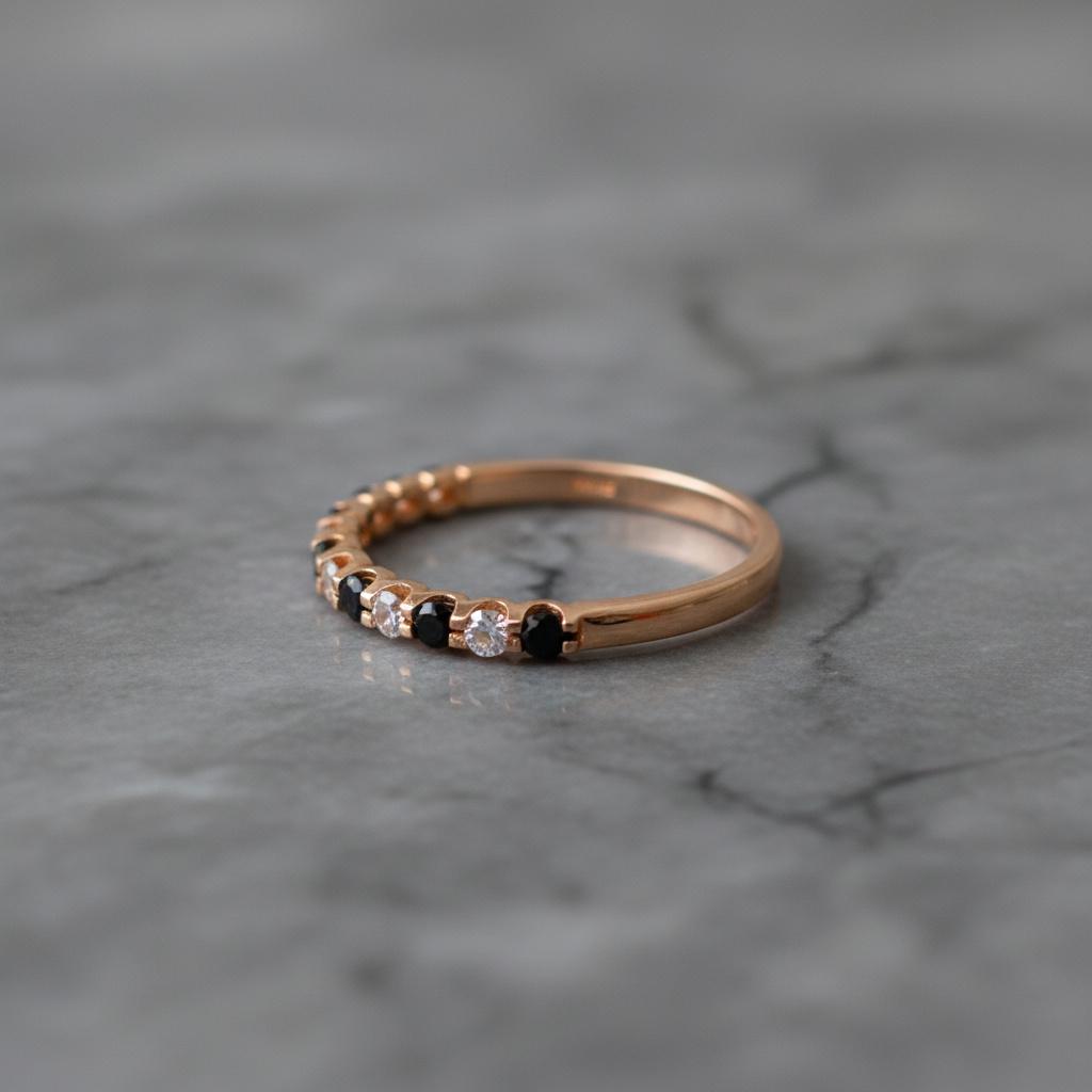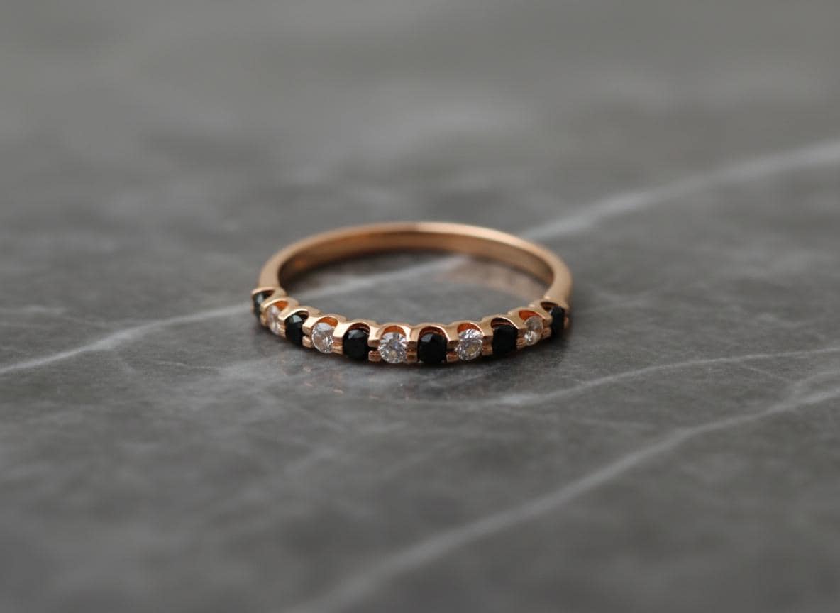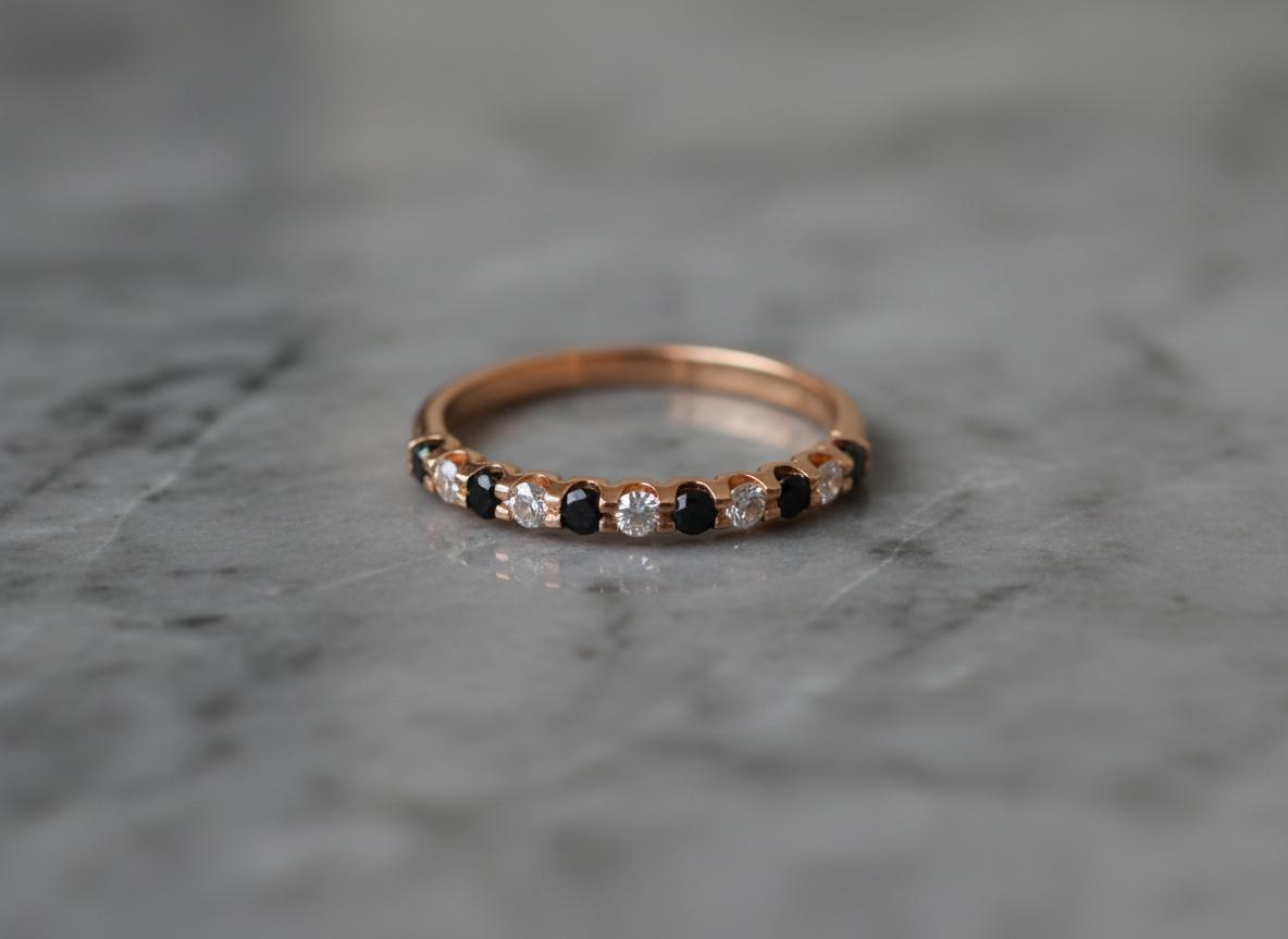 Crafted from high-quality 14k rose gold, this half eternity ring is designed for both beauty and durability. The alternating black and white diamonds create a striking contrast, adding a touch of glamour to any outfit. Whether you're celebrating a special occasion or simply treating yourself, this ring is sure to impress.