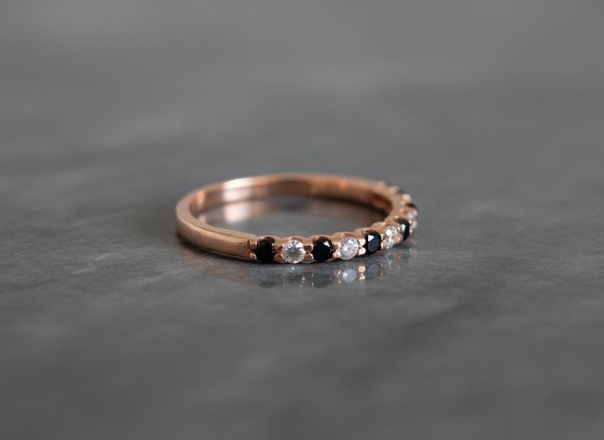 Introducing our exquisite 14k Rose Gold Half Eternity Ring, featuring a stunning combination of black and white diamonds. Each diamond measures 1.8mm, with a total carat weight of 0.27CT. This elegant ring is the perfect blend of classic sophistication and modern style, making it a timeless addition to any jewelry collection.