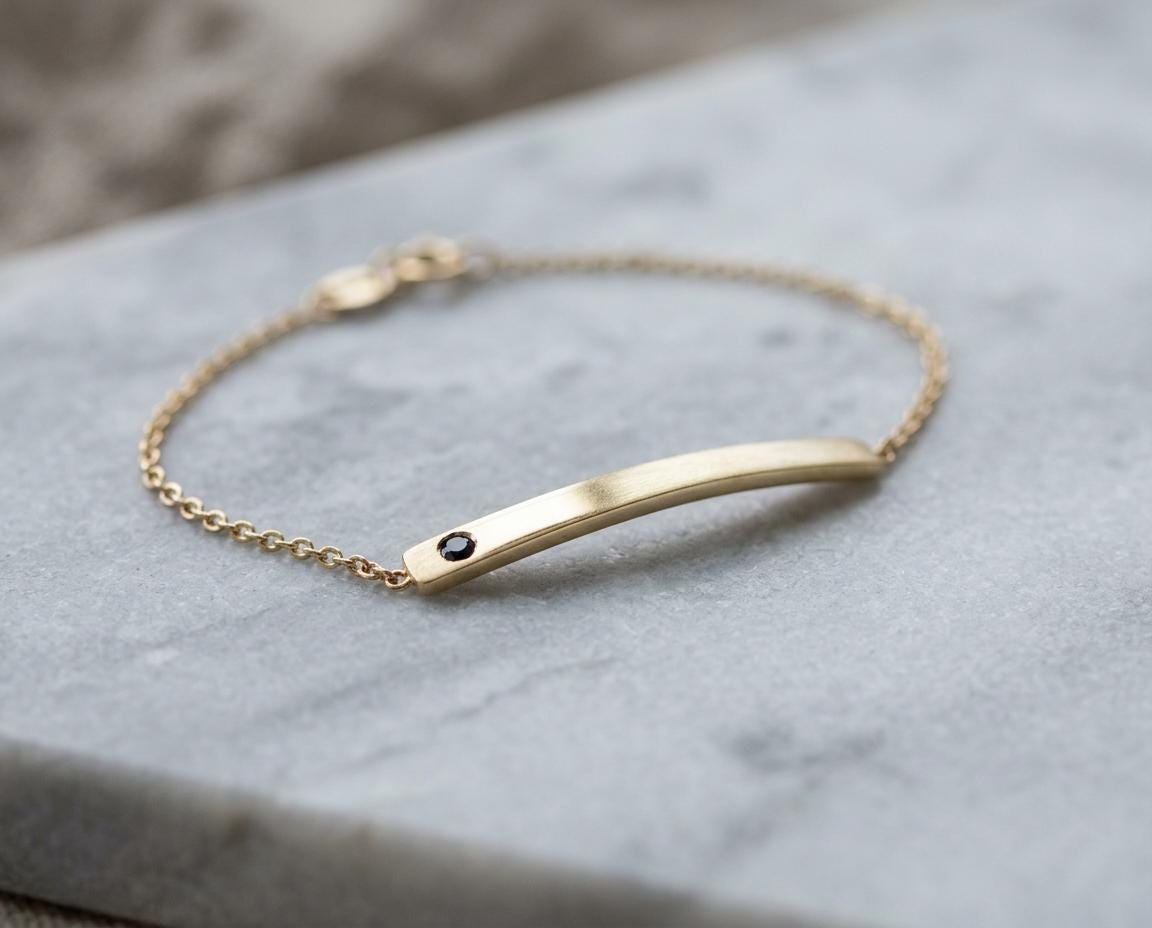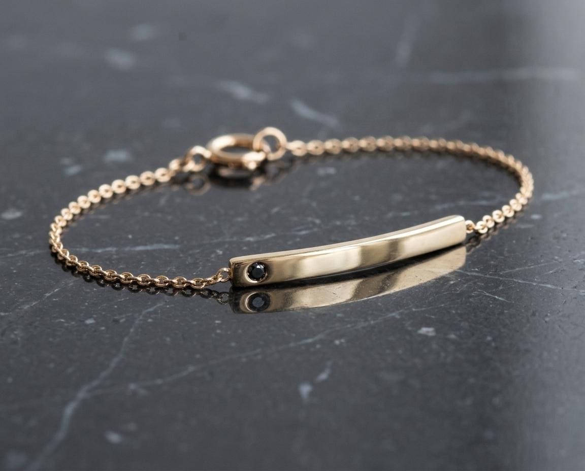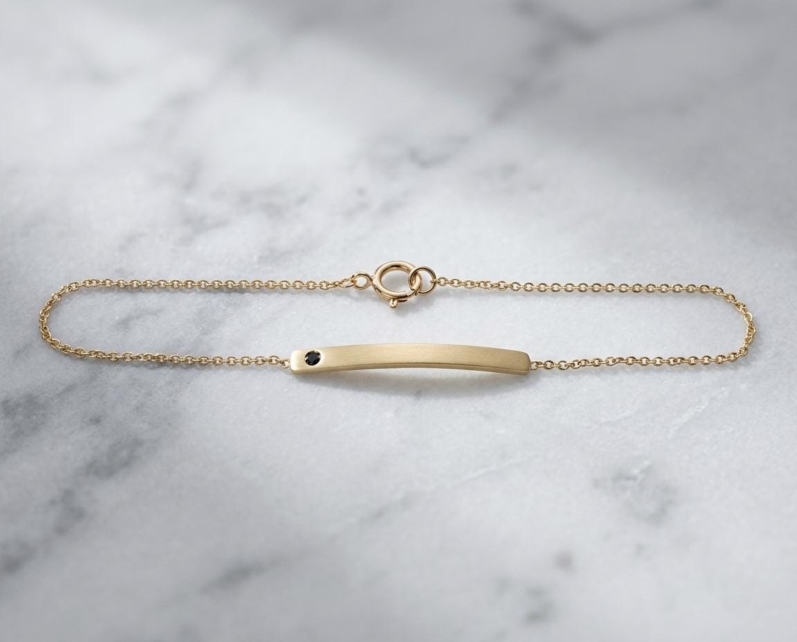 A study in refined minimalism, this handcrafted solid gold bar bracelet is designed for effortless daily wear. The centerpiece is a slim, curved 2.5mm bar with a soft satin finish, flush-set with a single 1.8mm natural black diamond. The dark stone provides a subtle, modern edge against the warm glow of the gold.