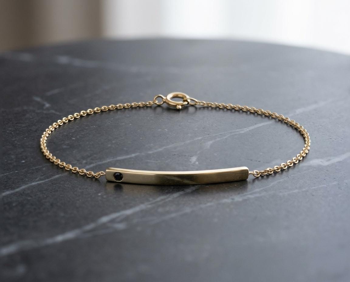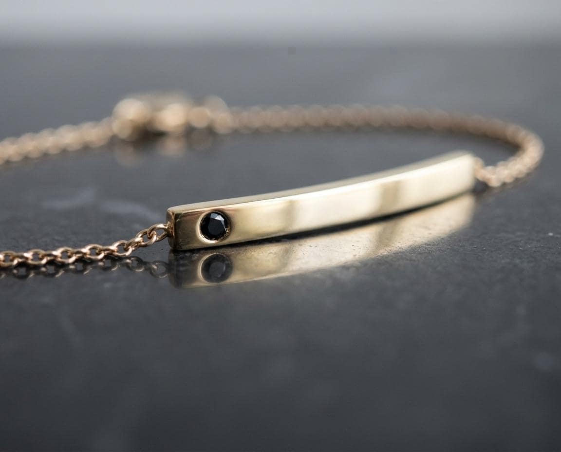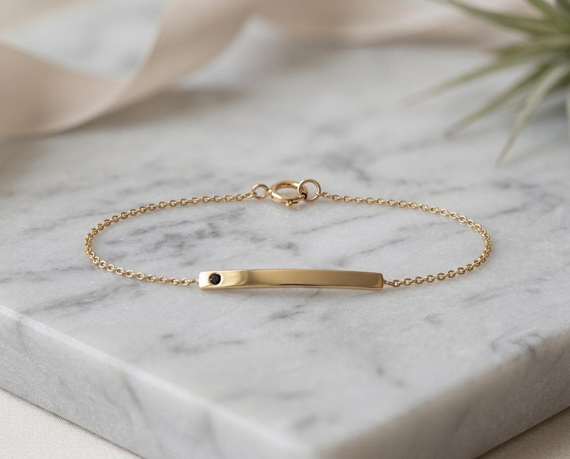 A study in refined minimalism, this handcrafted solid gold bar bracelet is designed for effortless daily wear. The centerpiece is a slim, curved 2.5mm bar with a soft satin finish, flush-set with a single 1.8mm natural black diamond. The dark stone provides a subtle, modern edge against the warm glow of the gold.