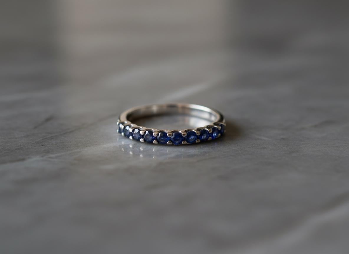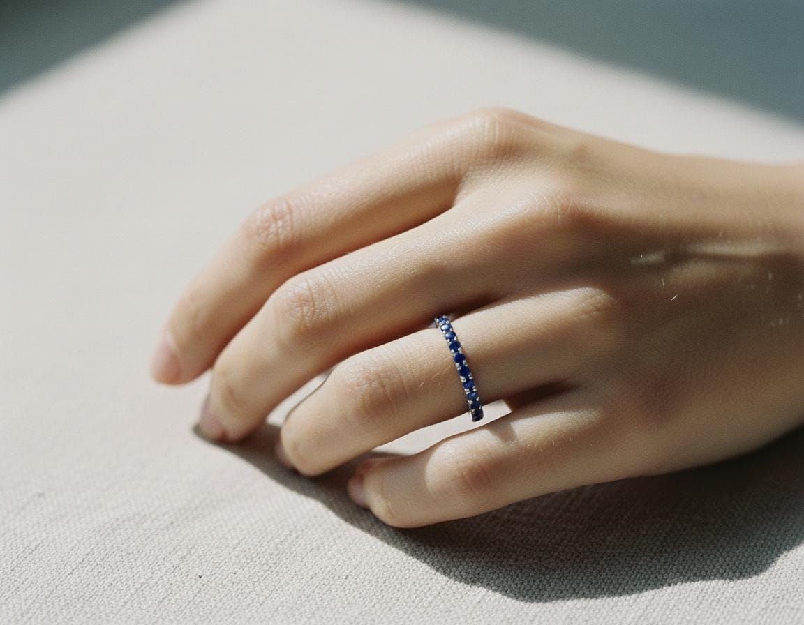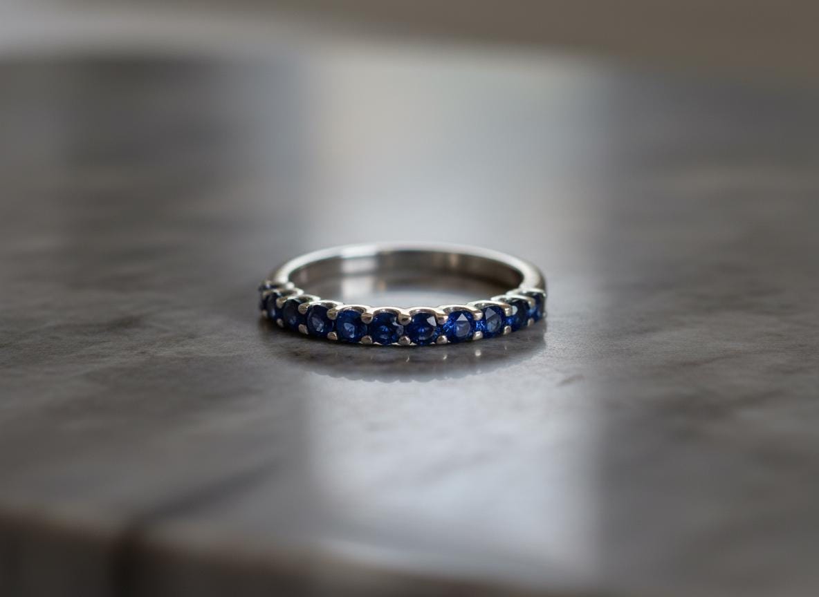The sapphires are set closely in a classic shared-prong design, creating a clean, continuous line of vivid blue sparkle. Whether worn alone, paired with an engagement ring, or stacked with other bands, this piece adds an effortless, modern sophistication.