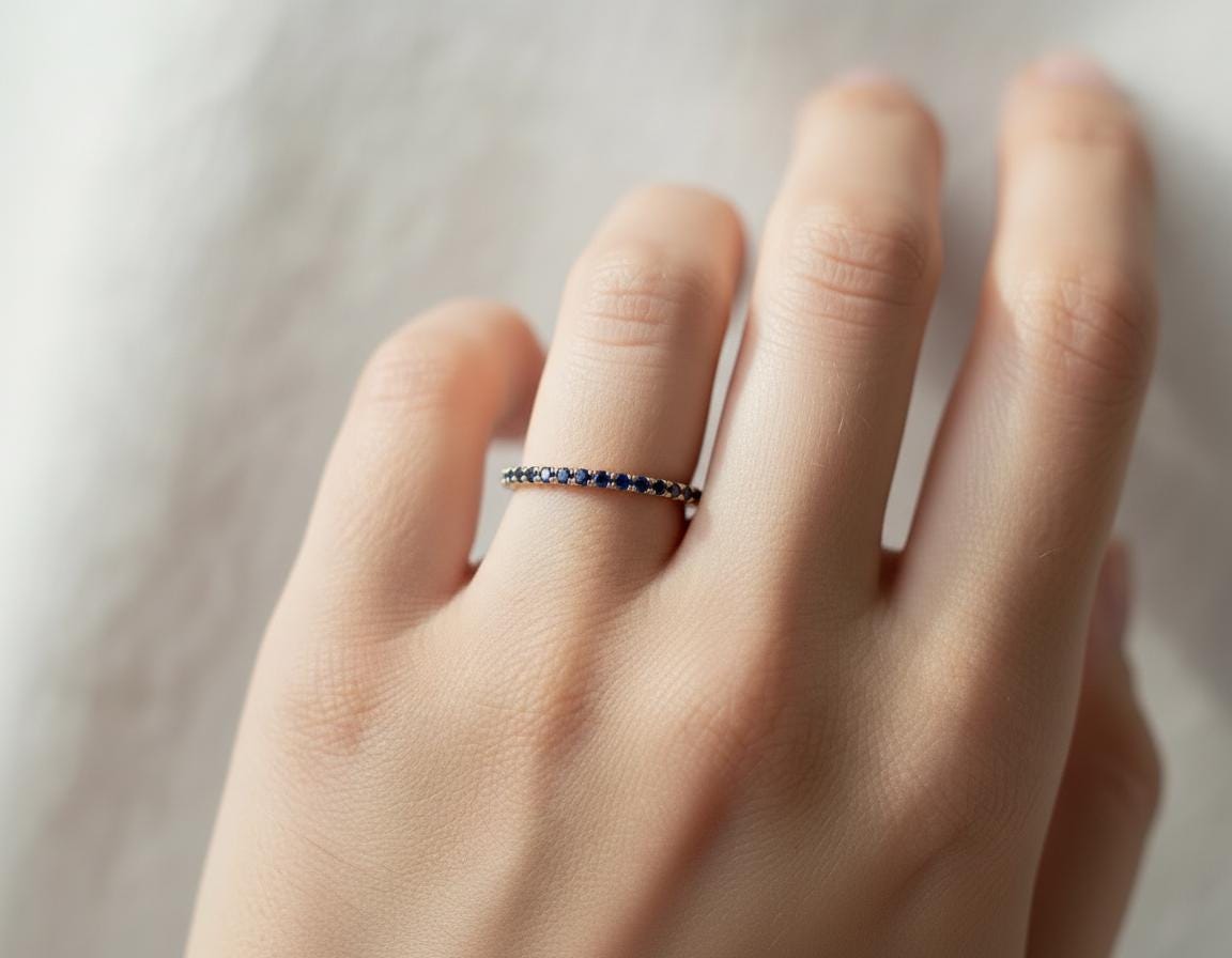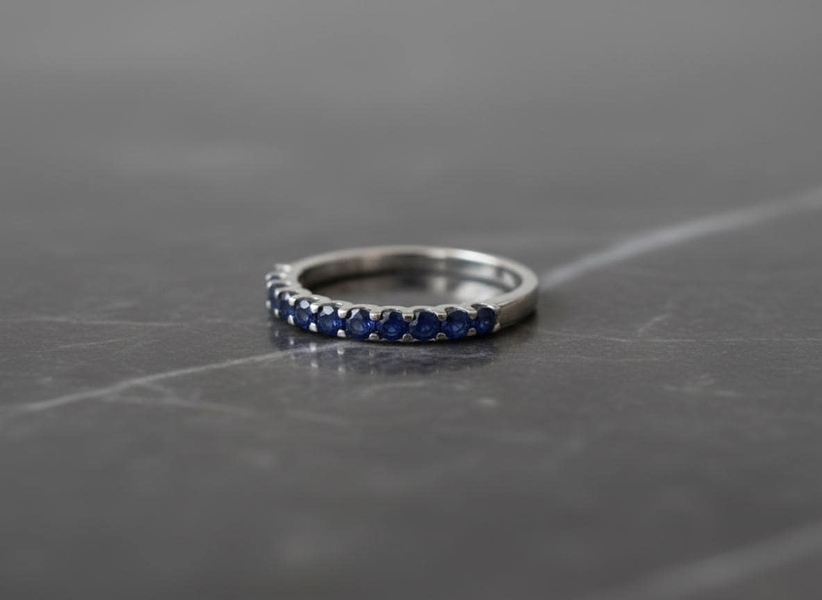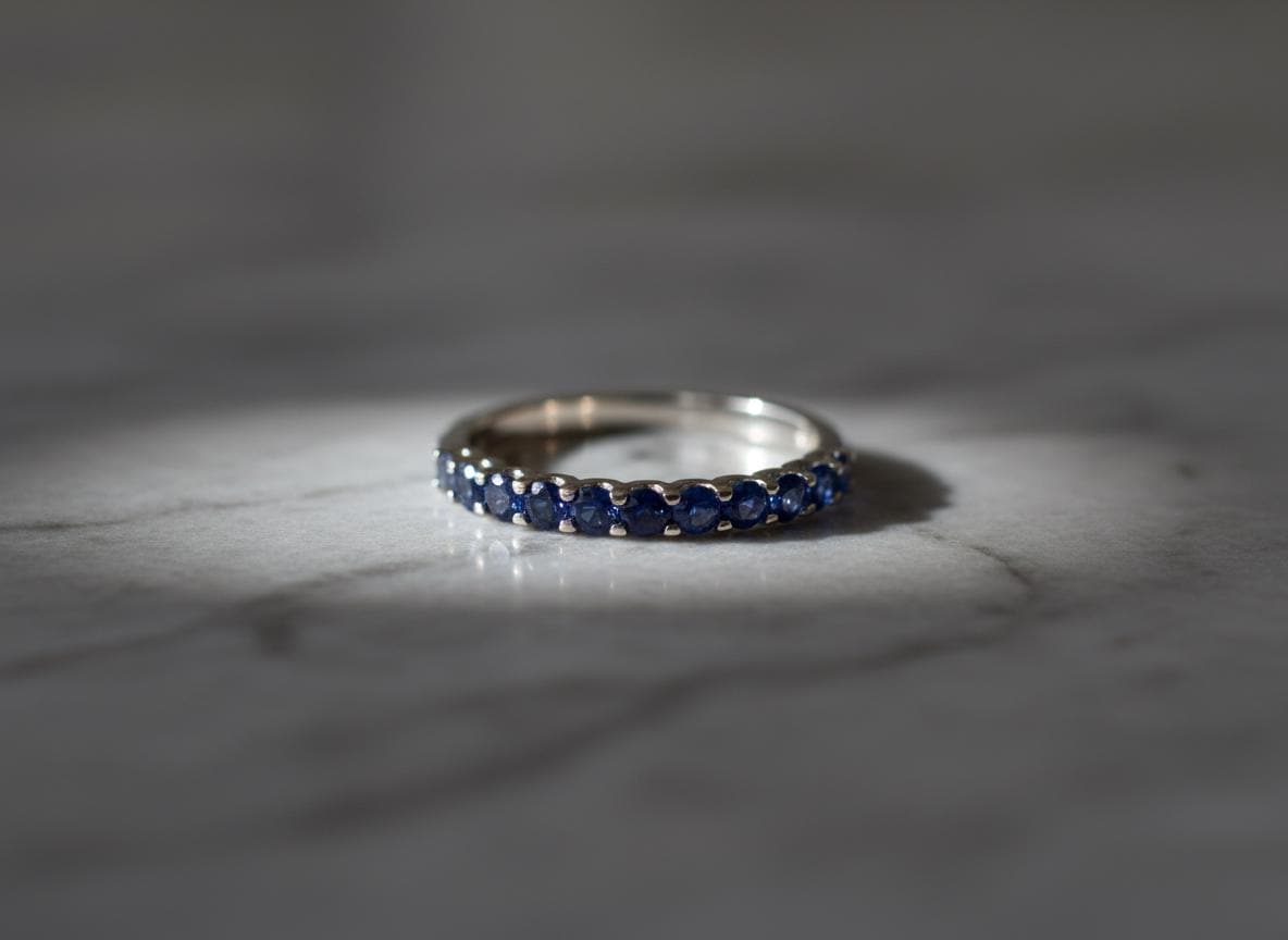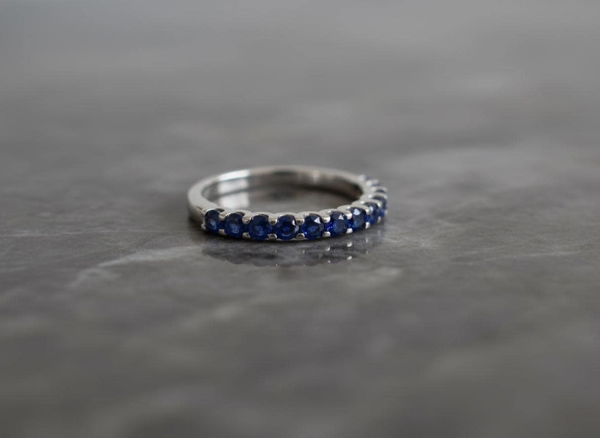 A whisper of blue light wrapped around your finger—this half-eternity sapphire ring is a timeless piece crafted in solid 14k white gold and set with 11 natural blue sapphires, each 1.9mm in diameter. Delicate, refined, and endlessly wearable, it brings a soft touch of color and elegance to your everyday style.