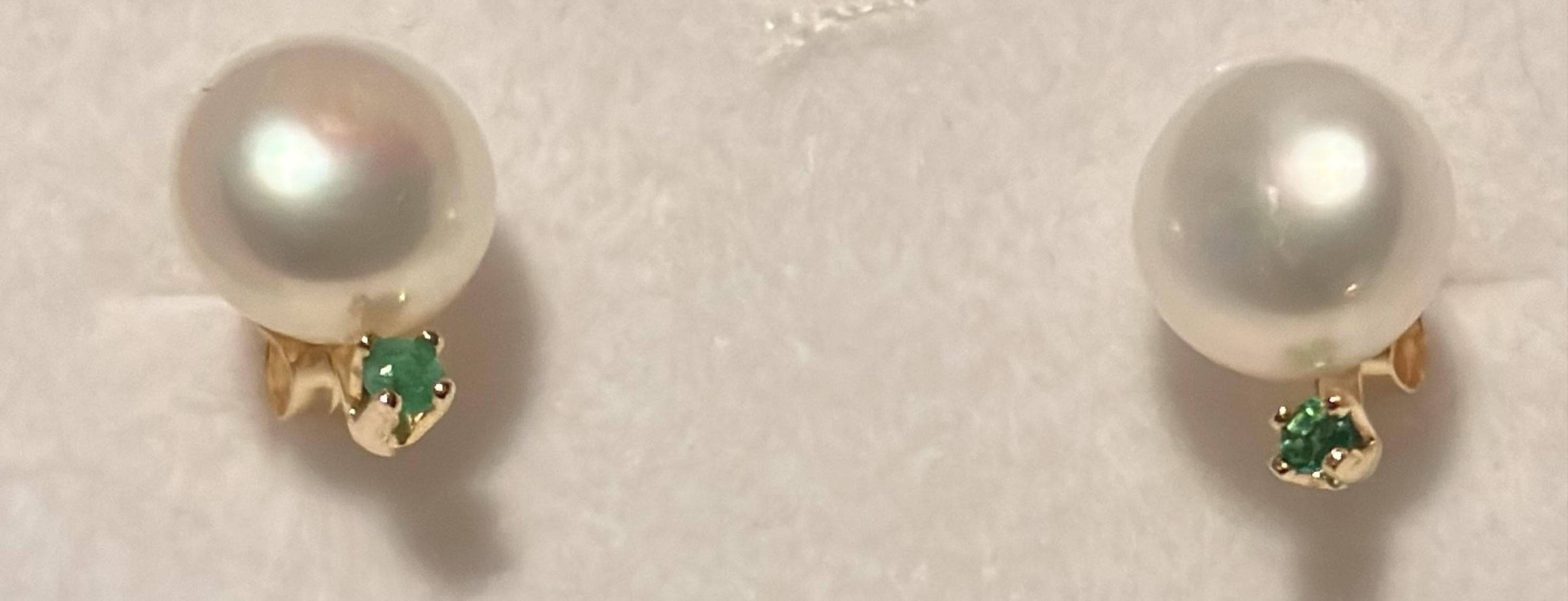 Elegant 14k gold stud earrings with 6mm white pearls and tiny (1.8mm) emerald stones. Will make a great gift for your loved ones or for yourself! 14k gold ear nuts are included with these earrings.