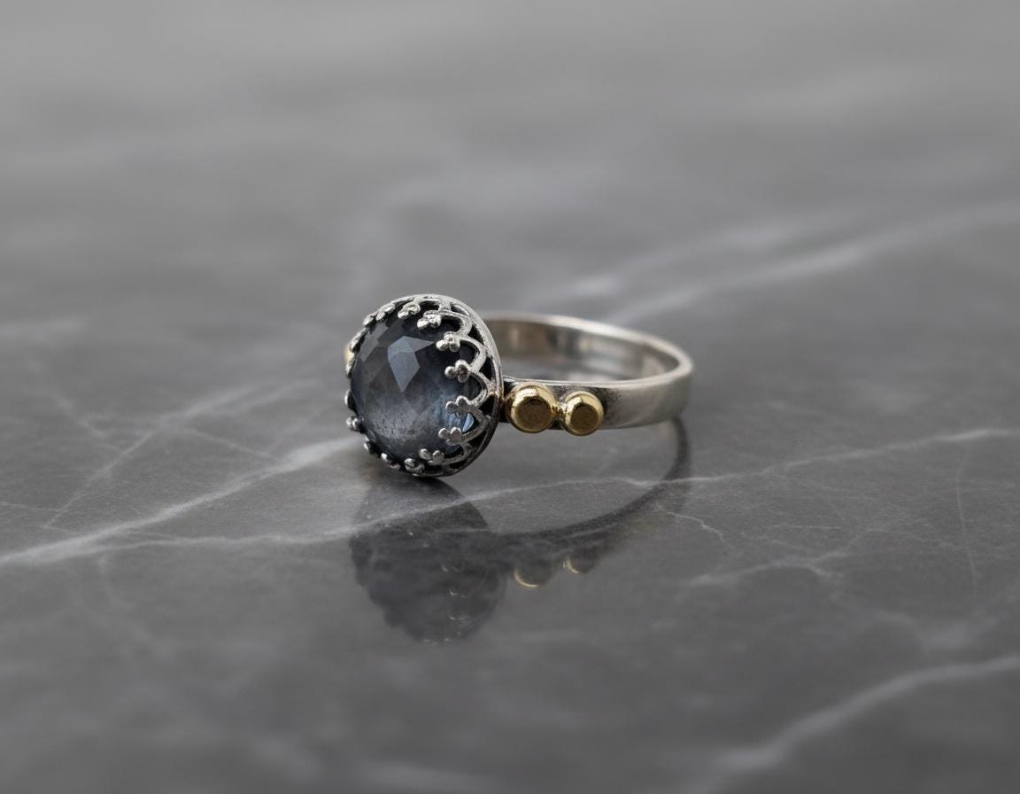 A beautiful everyday silver ring with a labradorite gemstones and recycled 10k ball elements. Please select size from drop down menu.