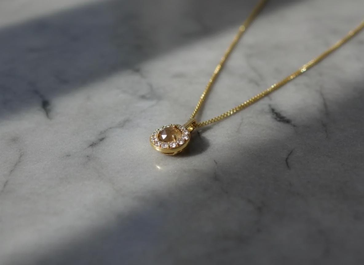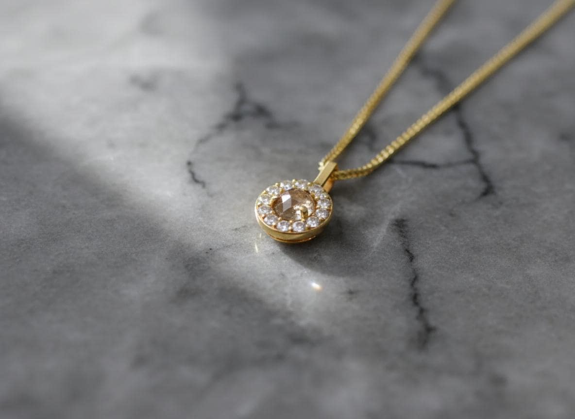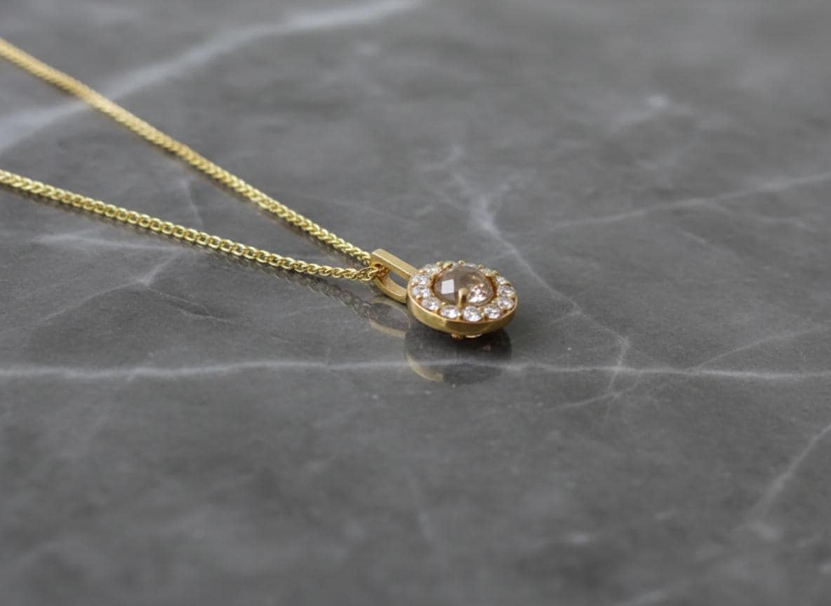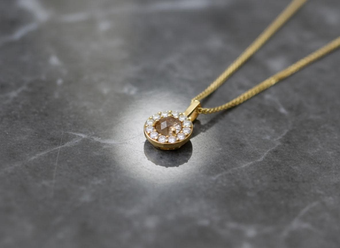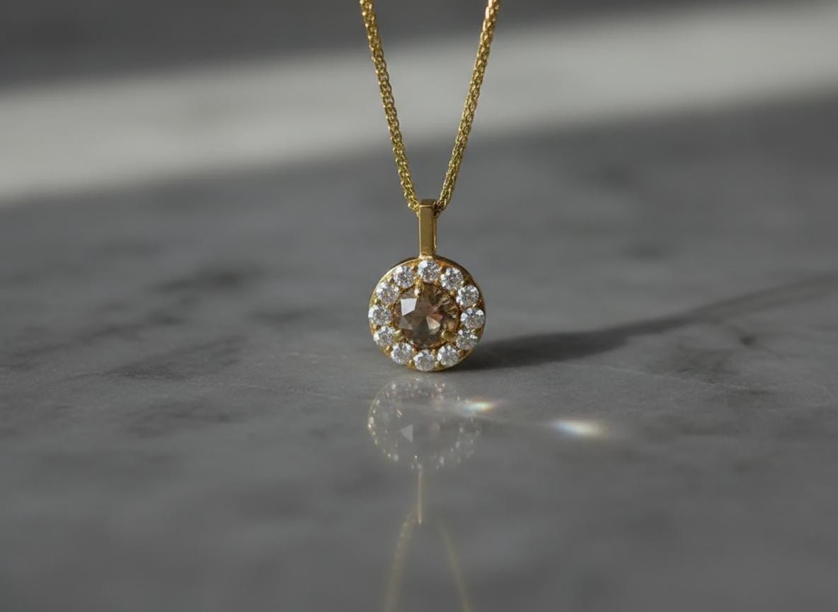 This elegant 14K gold halo pendant features a captivating 3mm rose cut brown diamond (0.15 CT) surrounded by a halo of sparkling 1.1mm SI-clarity white diamonds (0.07 CT total weight). The warm, earthy hue of the center diamond contrasts beautifully with the brilliant halo, creating a timeless yet unique look.