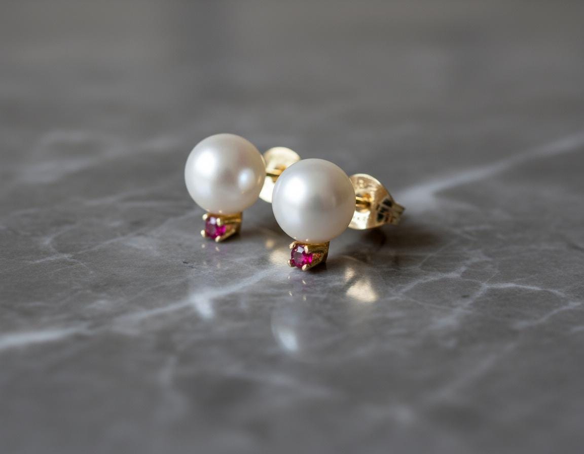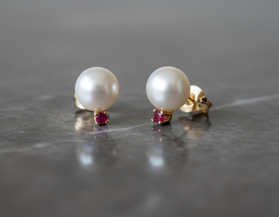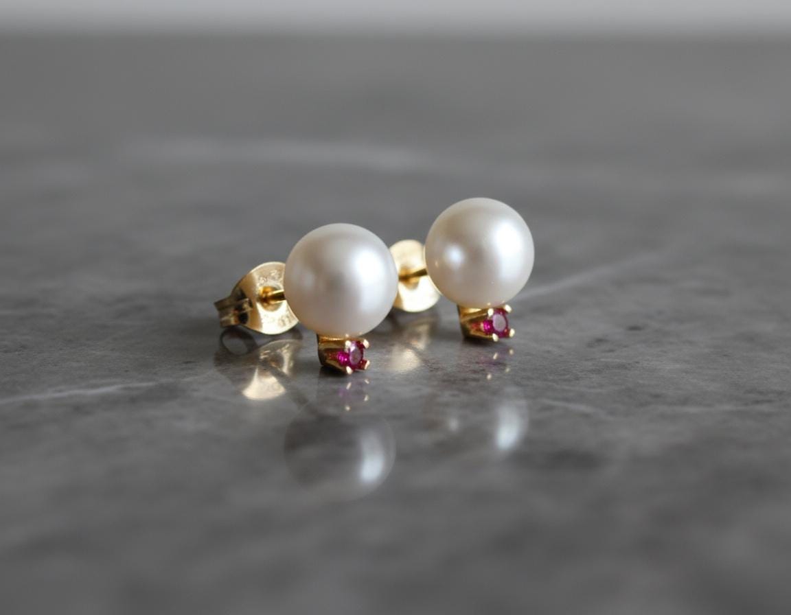 Elegant 14k gold stud earrings with 6mm white pearls and tiny ruby stones. Will make a great gift for your loved ones or for yourself! 14k gold ear nuts are included with these earrings.