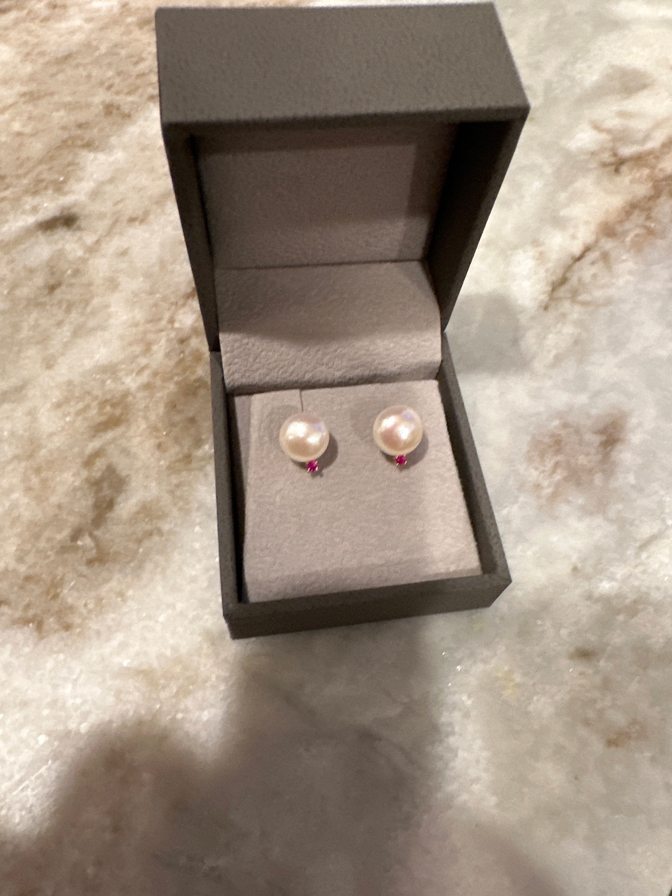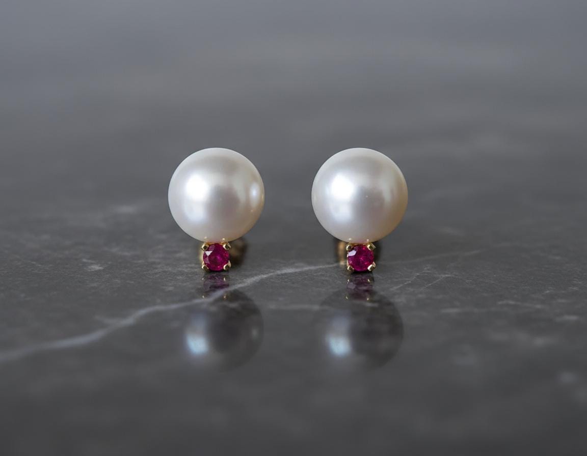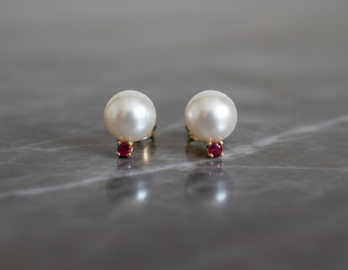 Elegant 14k gold stud earrings with 6mm white pearls and tiny ruby stones. Will make a great gift for your loved ones or for yourself! 14k gold ear nuts are included with these earrings.
