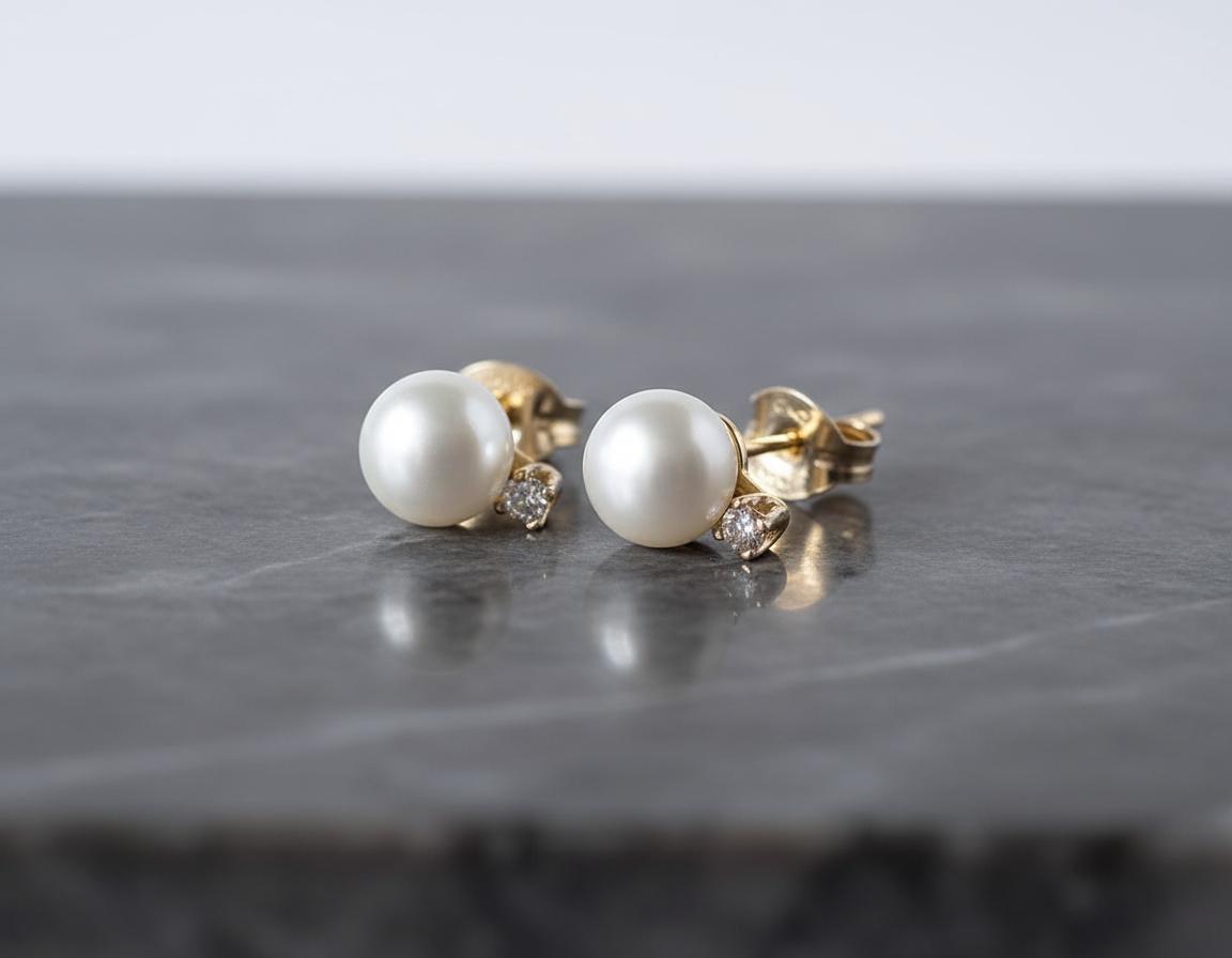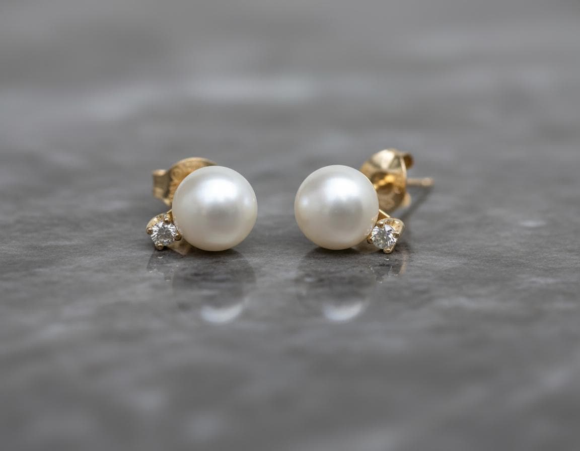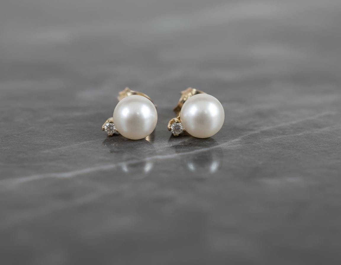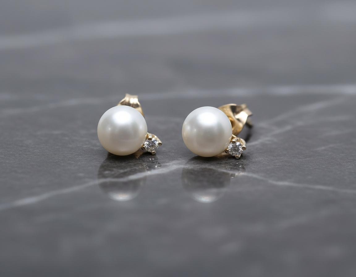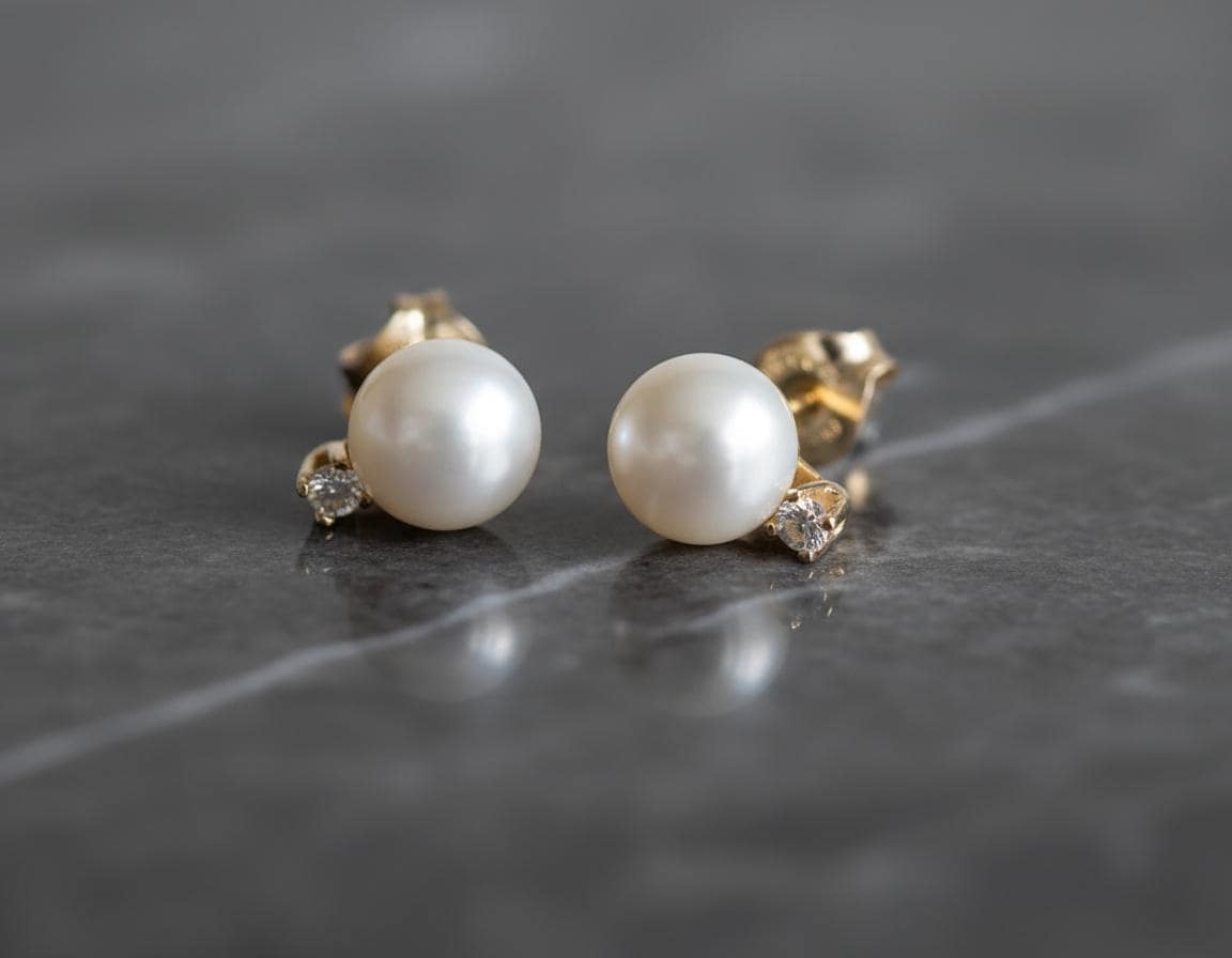 Elegant 14k gold stud earrings with 6mm white pearls and tiny Moissanites. Will make a great gift for your loved ones or for yourself! 14k gold ear nuts are included with these earrings.