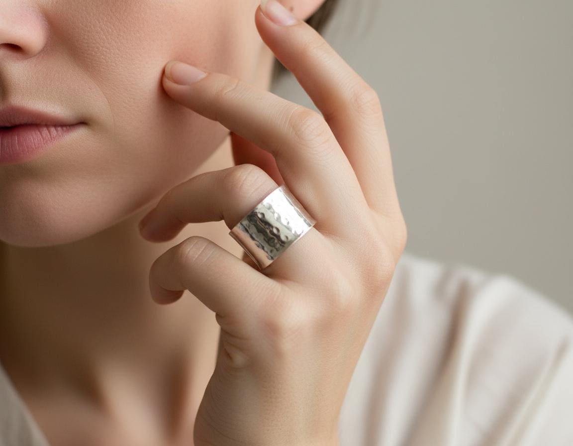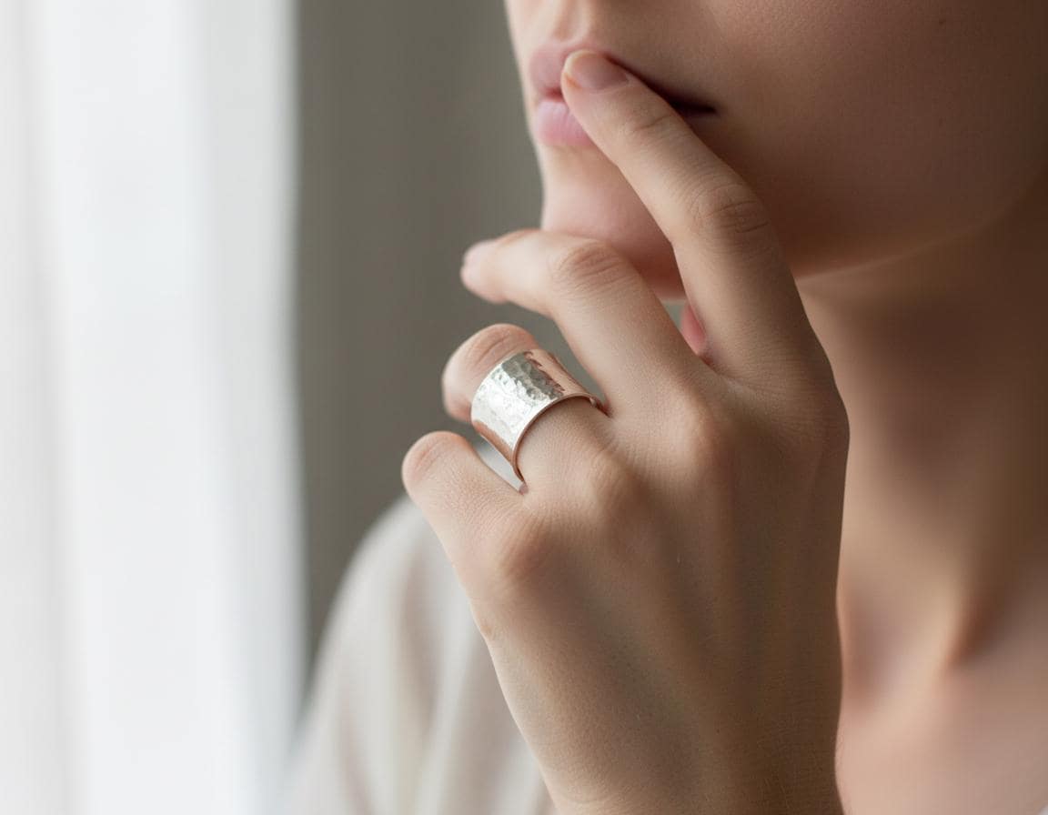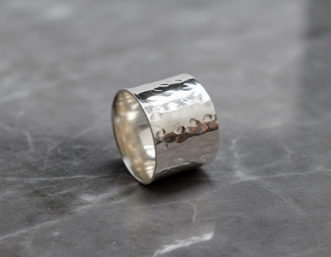 Bold, modern, and effortlessly elegant — this sterling silver ring features a 15mm wide band with a hand-hammered texture that reflects light beautifully. Each ring is crafted by hand, giving it a unique pattern and a refined yet organic character.