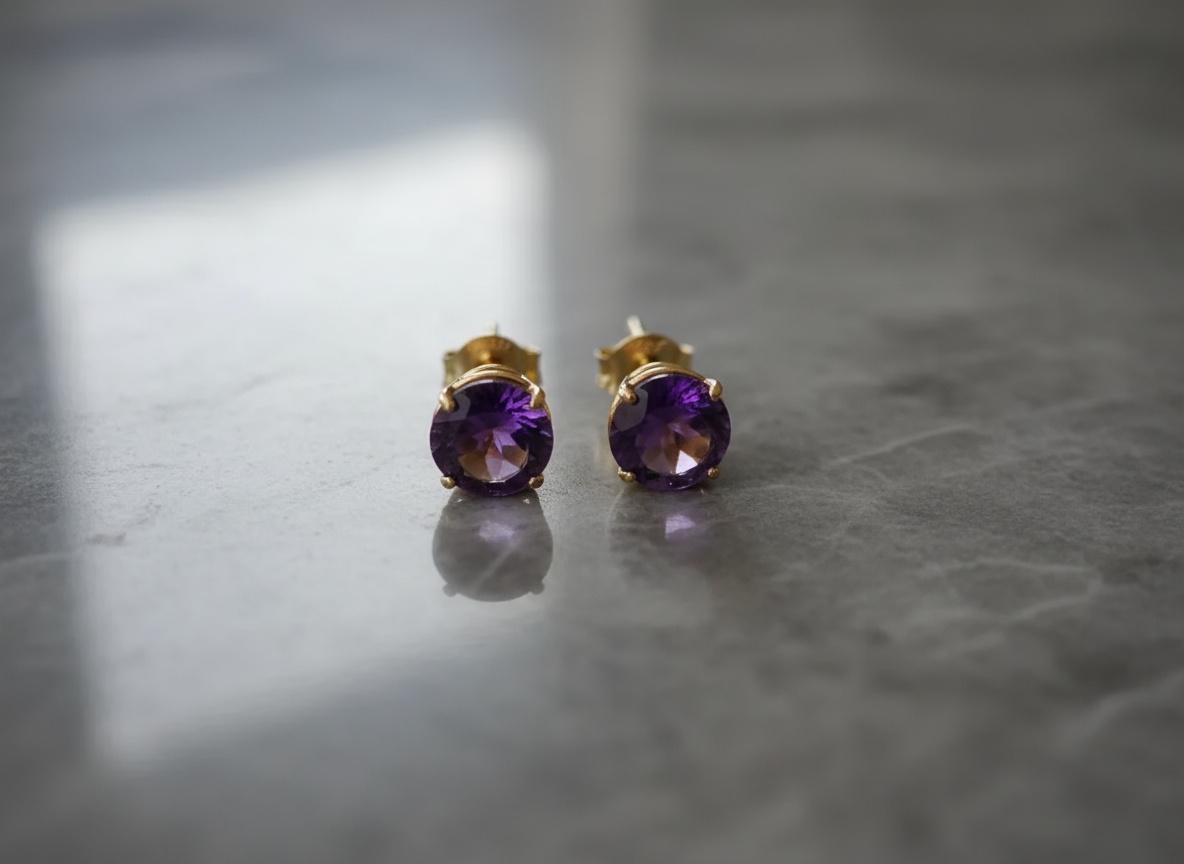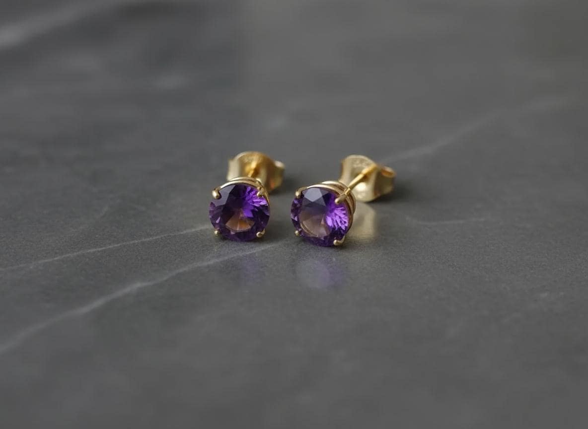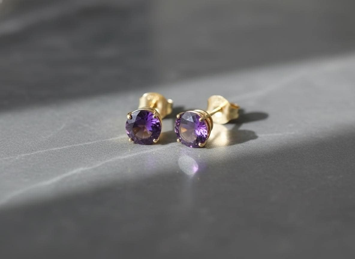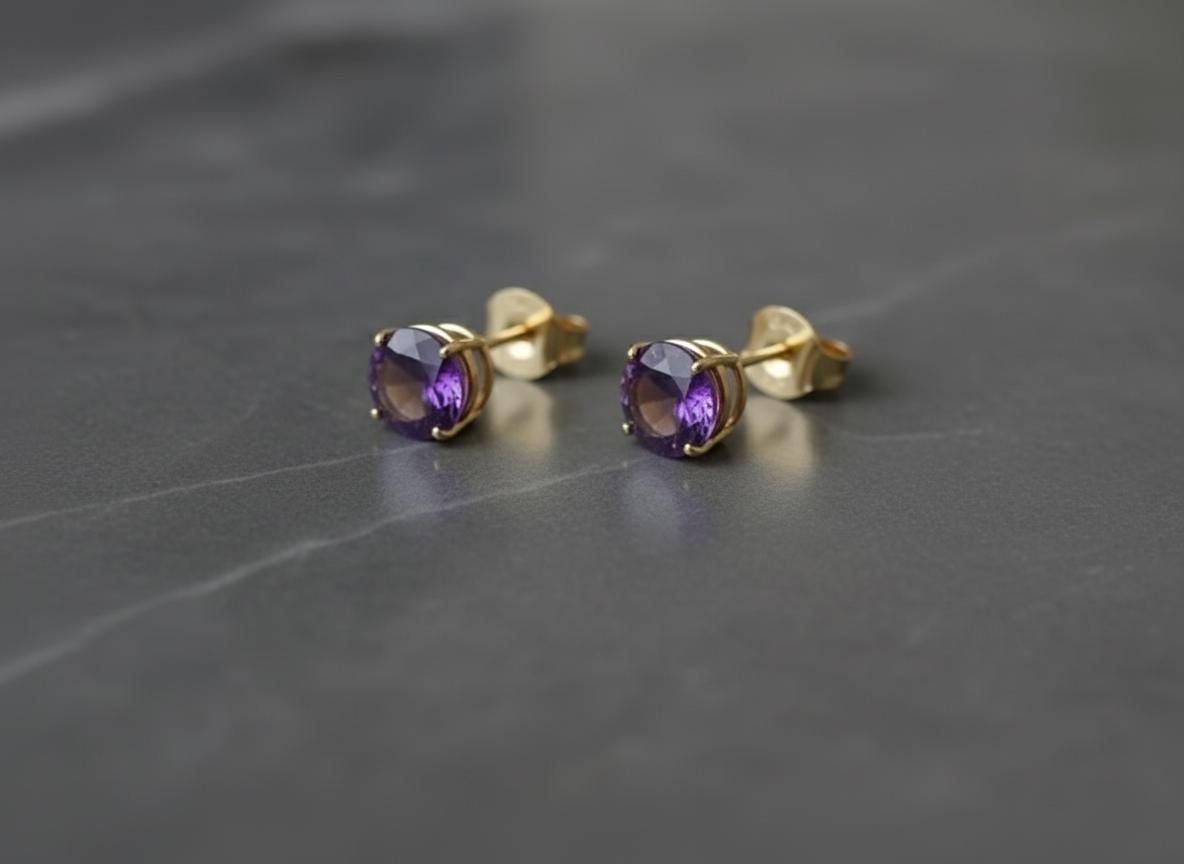 These elegant 14K gold amethyst stud earrings feature vibrant 6mm round-cut natural amethysts, set in secure four-prong settings. The rich purple hue makes them perfect as a February birthstone gift or a timeless everyday accessory.
