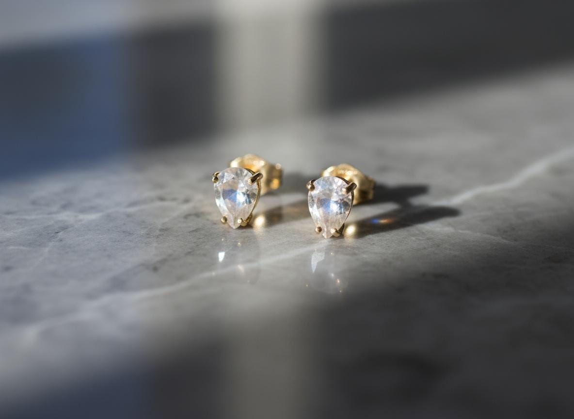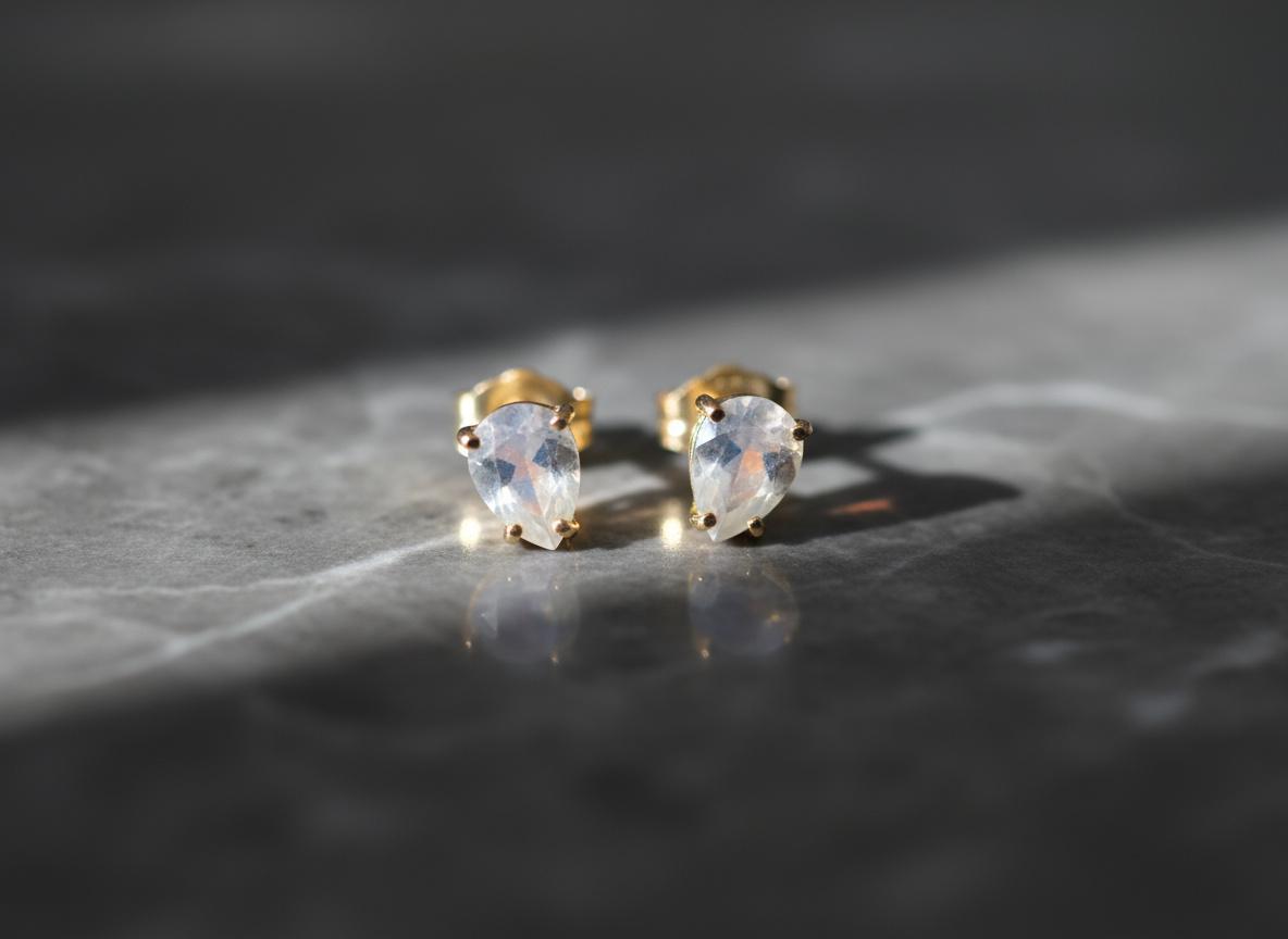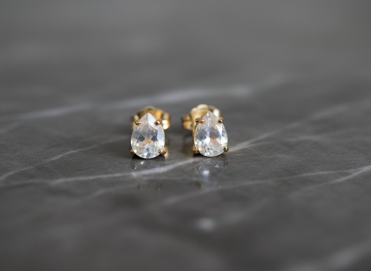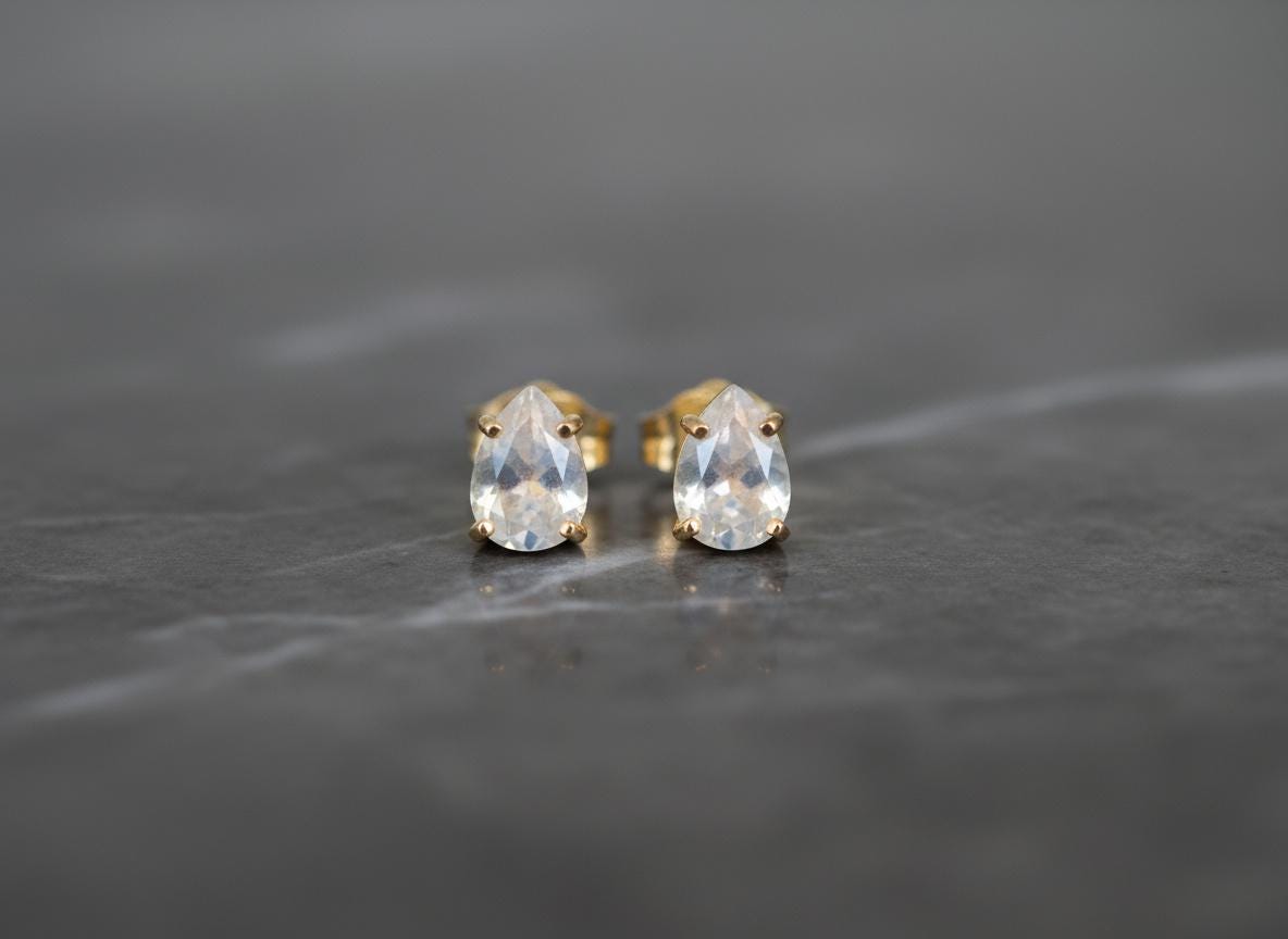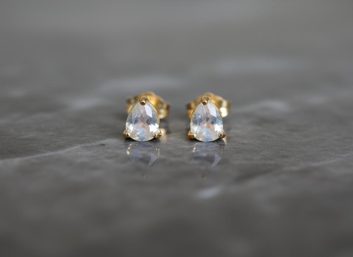These 14K gold moonstone stud earrings feature beautiful 4x6mm pear-shaped natural moonstones with a captivating rainbow sheen. Set in classic prong settings, these delicate studs radiate elegance and are perfect for everyday wear or as a special gift.